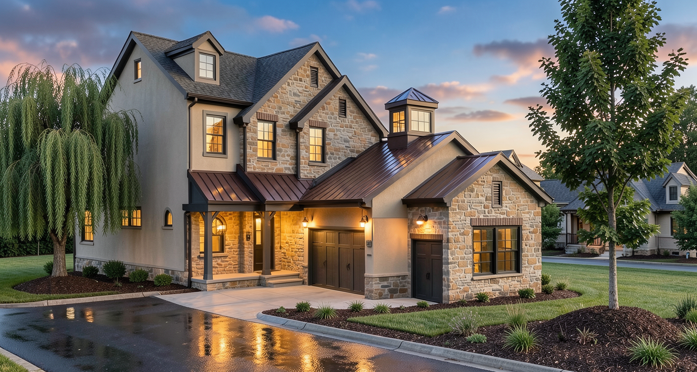 brick veneer with german schmear copper roof over bay window only dark green board and batten shutters no hipped roof brick cornice