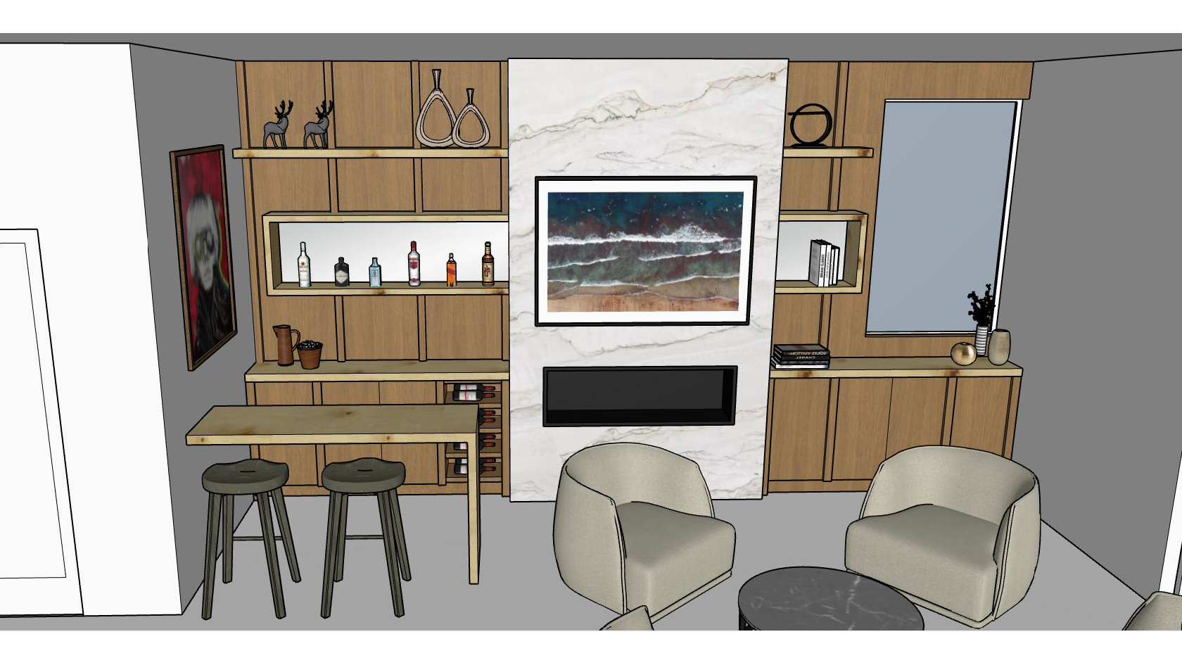 flooring is a large format light colored tile the cibbies tha thold bottles on the left side have mittor at the back the same applies to the right side where the books are the polished marble on the fire plae wall has glossy finished and can you add fire to the fire place