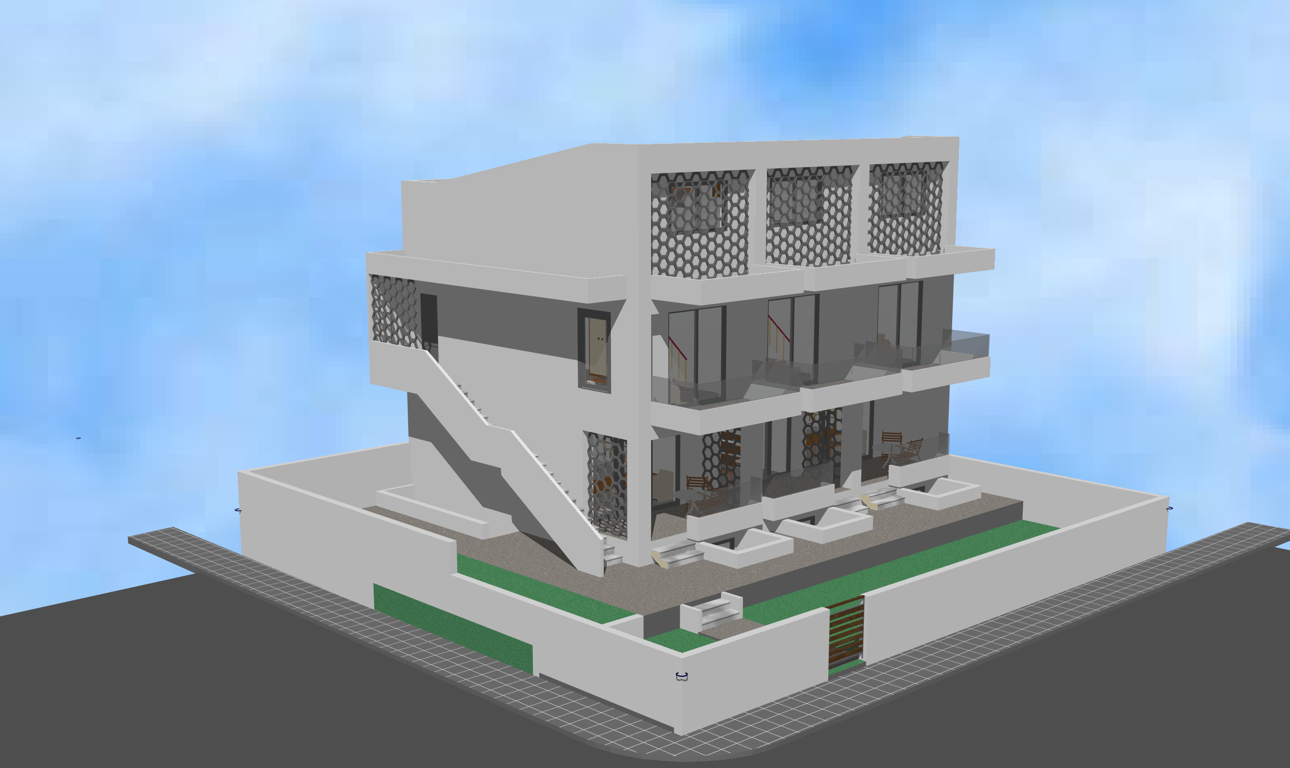 spacious balconies with glass railings elegant outdoor stairs grassy patches in vibrant green concrete pathways in soft gray set against a bright blue sky with subtle clouds warm afternoon sunlight casting gentle shadows atmosphere of tranquility and contemporary elegance