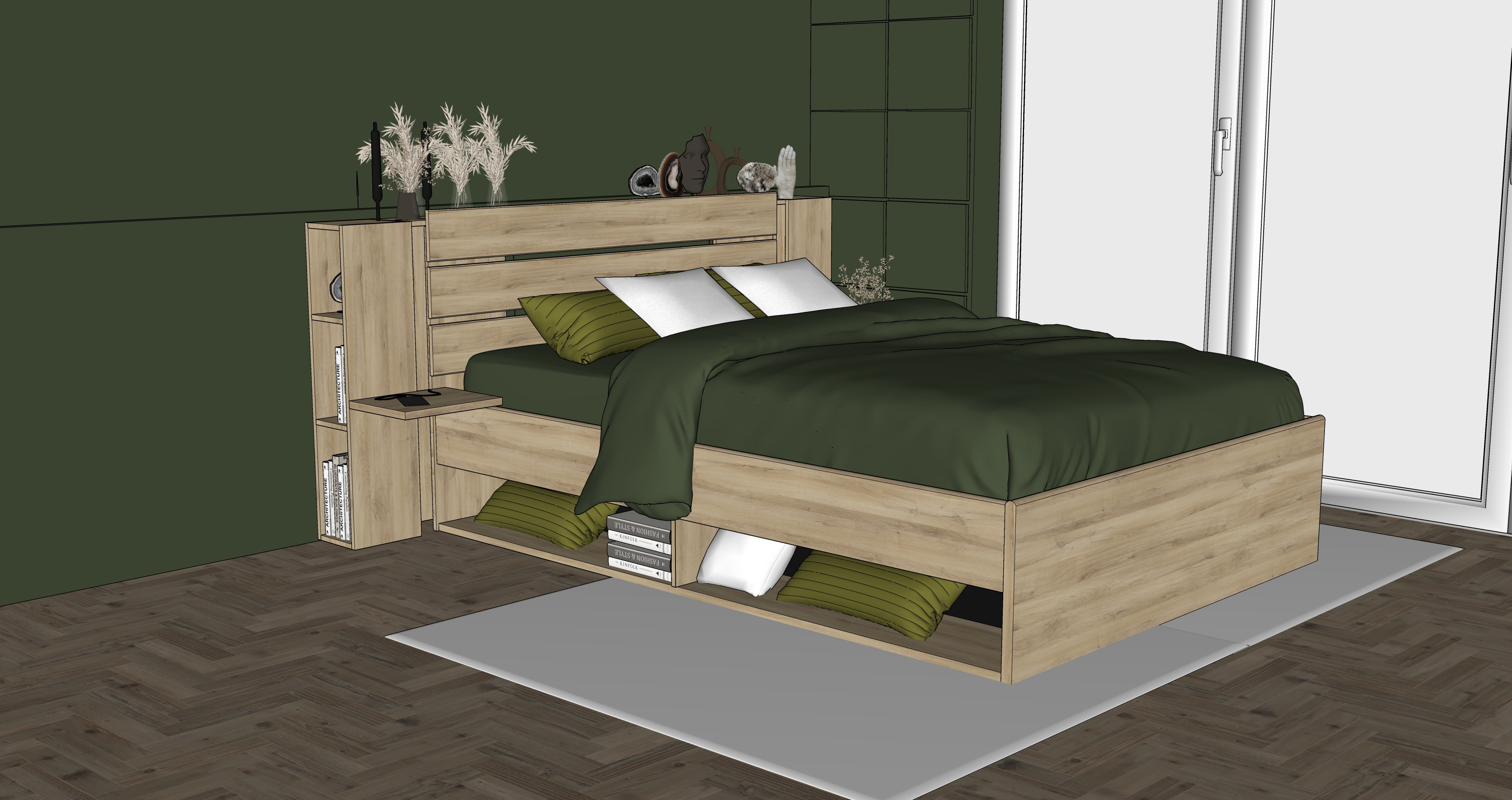 chambre moderne et chaleureuse au design naturel grand lit avec drap beige couvertures vert fonc et coussins assortis mur d coratif vert textur plantes tombantes fix es en hauteur suspensions avec ampoules vintage en verre sol en bois clair grand tapis gris chaussures dans les niches basses du lit ambiance cosy style contemporain et minimaliste rendu photor aliste haute r solution pas d clairage de niche