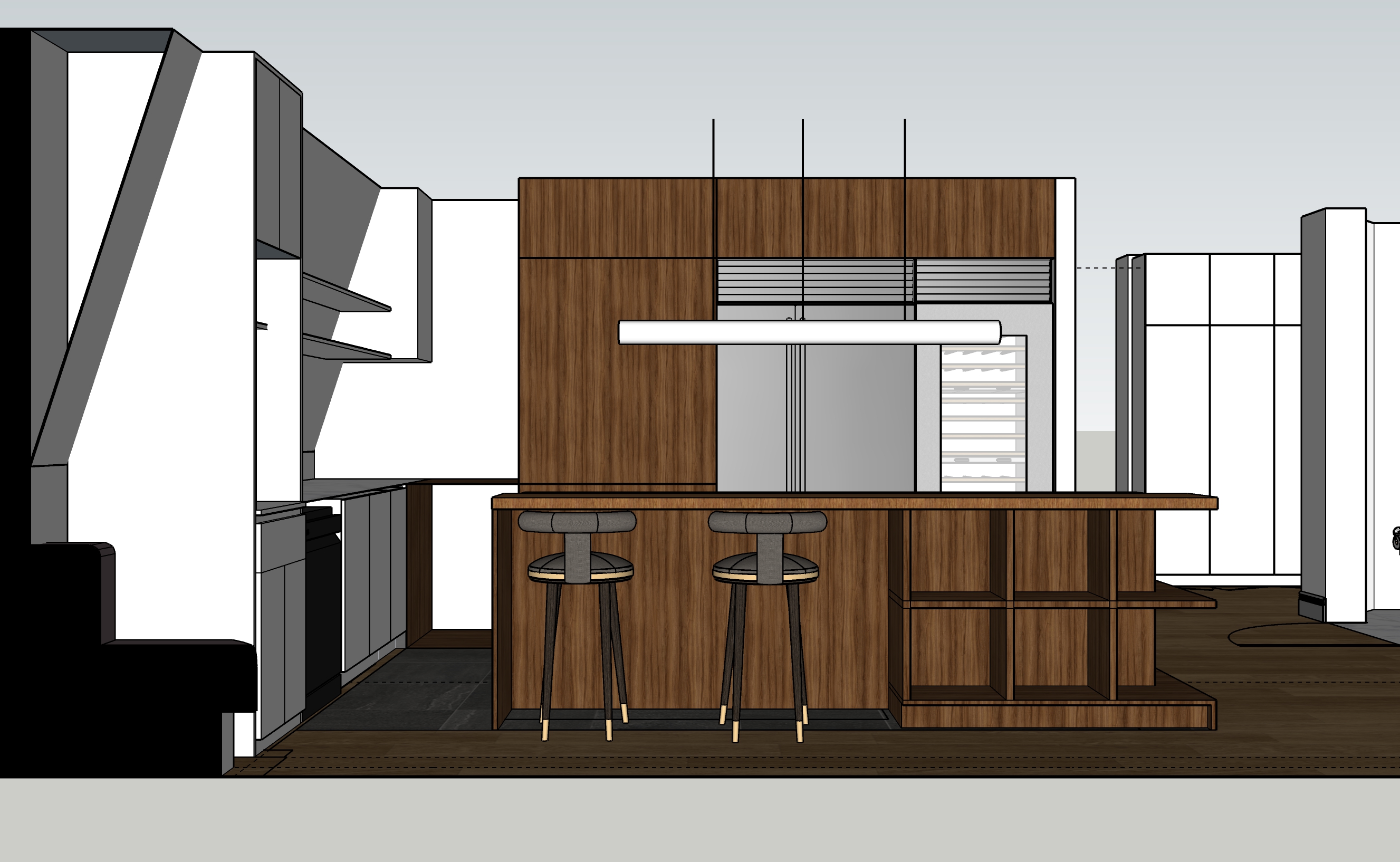 warm white kitchen with a dark oak kitchen cabinet with marble top island with dark oak bar counter on a sunny day