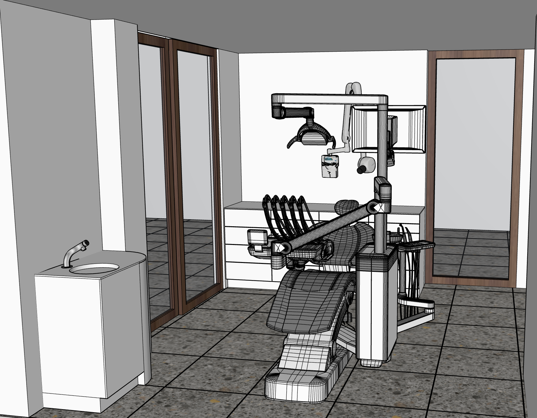 no additional plants or tools no exterior view to be added keep original materials keep the dental chair as in the 3d model no drawers on the left furniture floor is cheppo tile