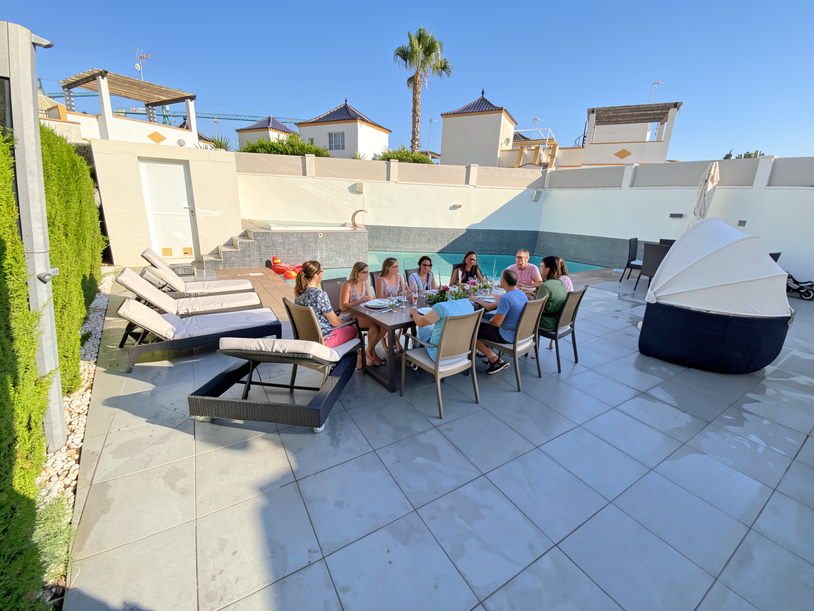 goal adjust this terrace image so the dining table clearly shows seating capacity for 12 guests show empty chairs only do not add any people dining area adjustment keep the existing table style and position add matching empty chairs so the table clearly has 4 chairs on each long side 2 chairs on each short side total 12 empty chairs all chairs must be empty no humans no silhouettes no people maintain realistic spacing and proportions do not enlarge the table unrealistically keep everything else unchanged keep 6 sun loungers aligned on the left keep hedge trimmed keep pool and architecture unchanged no plants added no redesign lighting natural mediterranean daylight lift foreground shadows slightly keep realistic look negative prompt no people no humans no guests no figures no silhouettes no cgi render look no oversized furniture no added vegetation