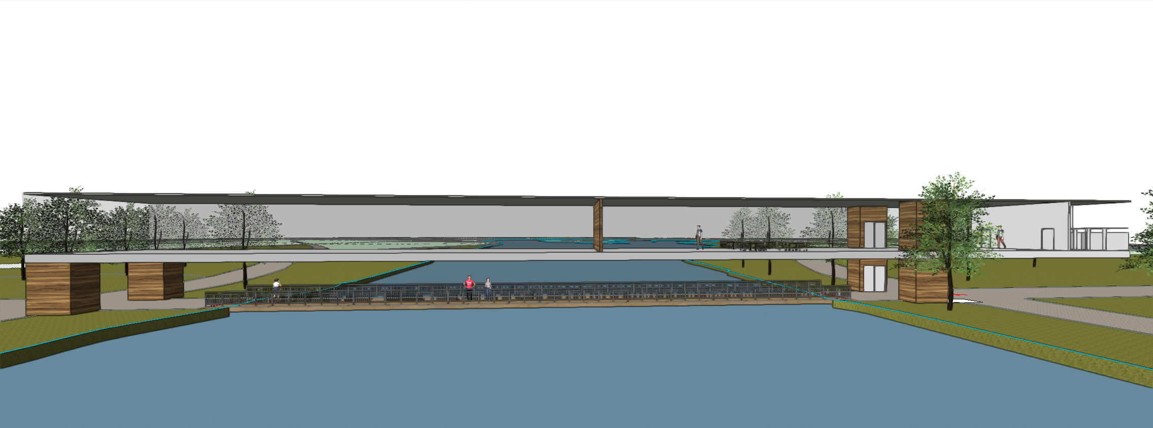 render the building in the picture on top of the blue bridge in st jame s park london in mies van de rohe style with a glass facade and green roof add elevators a staircase and other acessibility features keep design