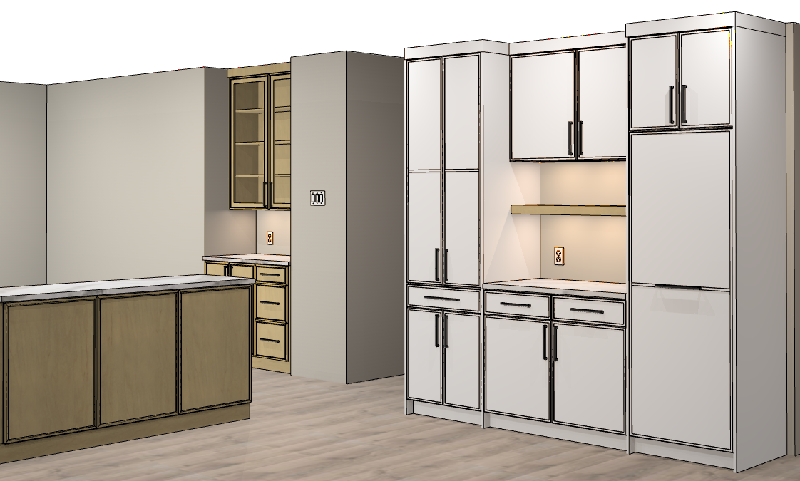 render a modern coffee bar ledge with a soothing and elegant atmosphere use soft beige walls white cabinets with black hardware as well as warm wooden cabinets with a light maple finish and black hardware the countertops should be a honed white marble incorporate a backsplash in the same finish as the countertops for added texture decorate with modern coffee bar fixtures for a contemporary touch ensure the lighting is warm and inviting with under cabinet lights for a cozy living room ambiance the flooring should be a light natural wood tone to complement the cabinetry completing the serene and stylish home lighting is soft evening summer night