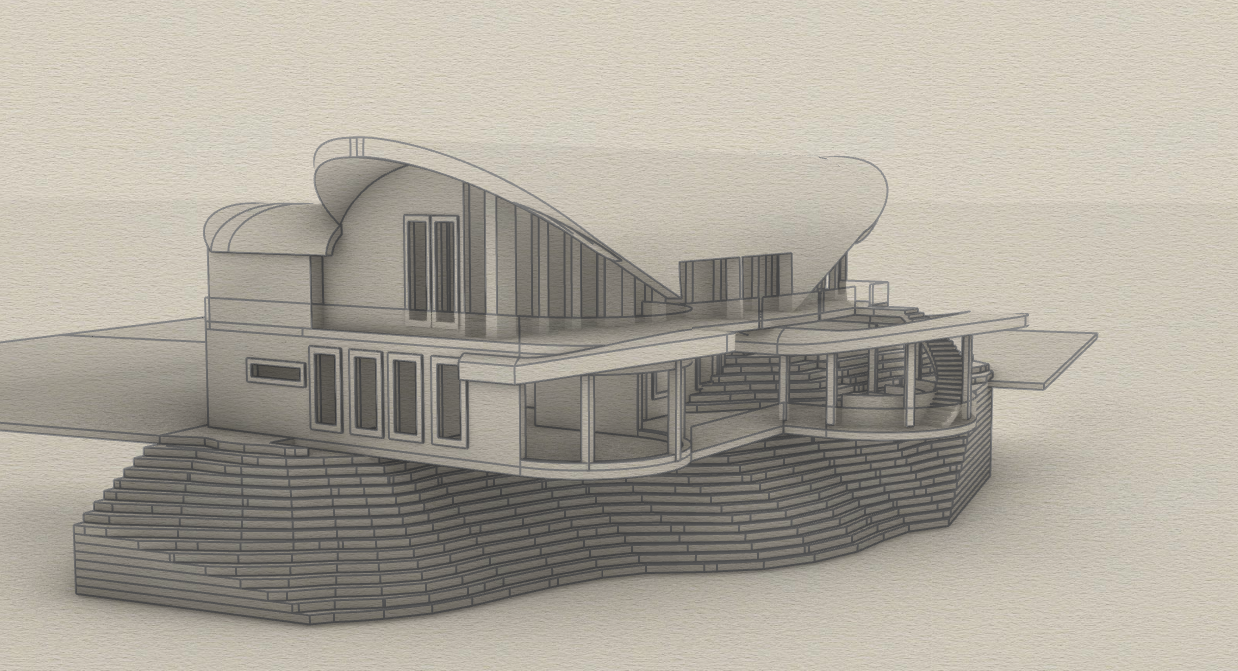 2 story research facility perched off a cliff sitting at a high elevation background filled with cloudy blue sky and mountains fog beneath it forest filled with trees behind the building black corrugated metal roof gray metal panel walls floor to ceiling glass framed with black steel warm light coming from the inside outdoor deck with amphitheater and curved roof above it railings along the balconies and deck