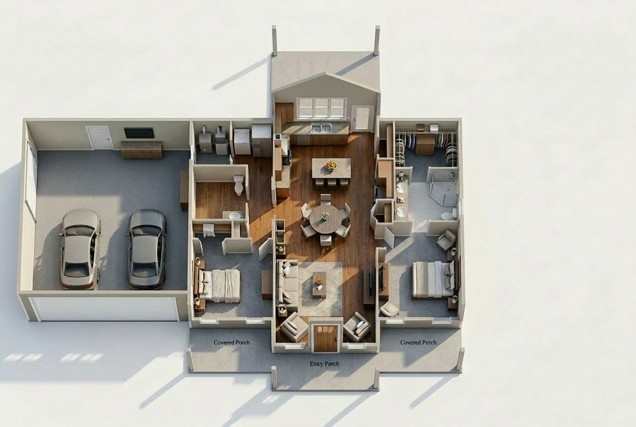convert this floor plan into a realistic isometric 3d view of a full house show the space from an elevated angle with furniture walls and details visible do not ad any rooms that are not on this image bathroom on left move toilet to left side wall use the same furniture as shows on the plan do not change the orientation of the floorplan