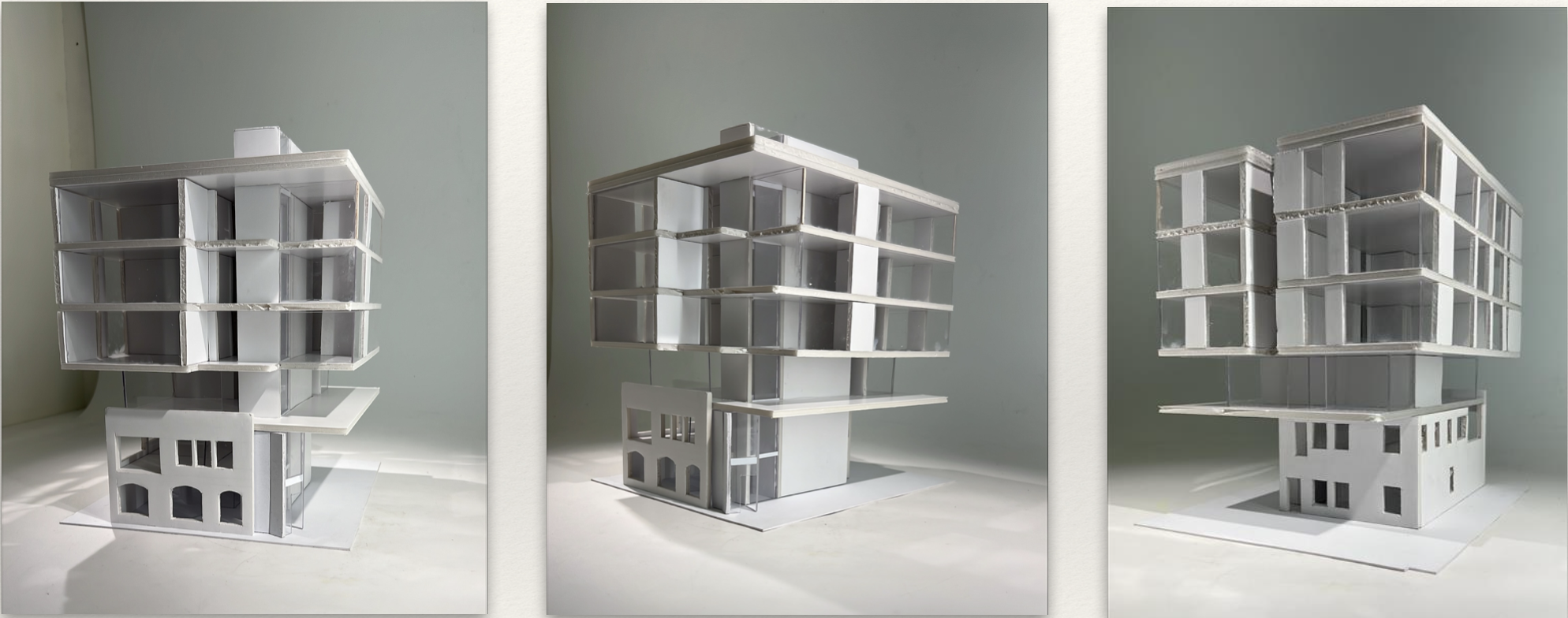 convert these physical massing model photos into a bold abstract architectural title page graphic reduce details enhance edges and use layered translucent colour blocks to emphasize the massing concept apply a limited palette inspired by architectural diagrams terracotta sage charcoal ivory add subtle grain texture and a soft vignette the final image should feel graphic expressive and conceptual like a poster for a midterm design crit where the building reads as a clear conceptual object rather than a literal model