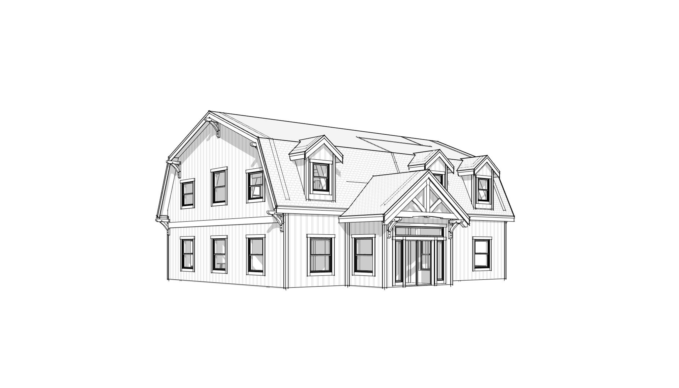 front view of a clean rustic gambrel style barn home architectural exterior home rendered in cinematic day time lighting with bits of blue skies and sunlight coming through the clouds barn home in a neighborhood setting with faint streaks of light coming through trees in the surrounding area warm glow and reflections off of the windows blue sky with big billowy clouds rustic select grade vertical wood siding green manicured landscape around structure with gardens and patches of grass black standing seam metal roof prominent trees in the background high fidelity photorealistic visualization crisp shadow falloff refined facade geometry soft atmospheric depth premium architectural photography mood ultra clean composition and materials black window trim flat roof photorealistic render small concrete path around the exterior of the cabin hide concrete footings grass in the foreground