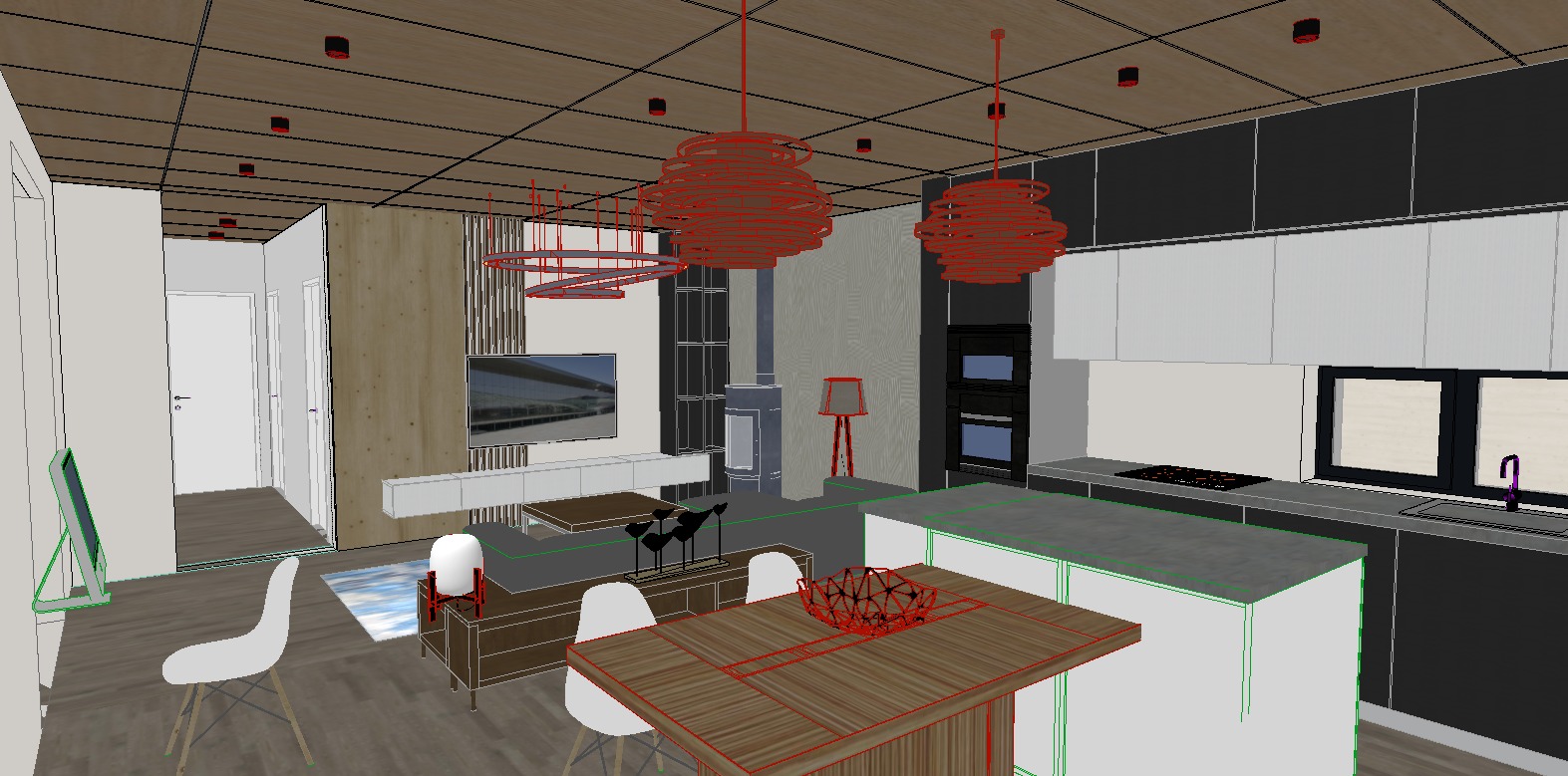 bright day time natural lighting soft shadows space is evenly liddownlights enterior photography realisticslightly reflective led ip lighting bellow the upper cabinet in the kitchen a dark teal herringbone patterned tiles on the backsplash in the kitchen black appliances