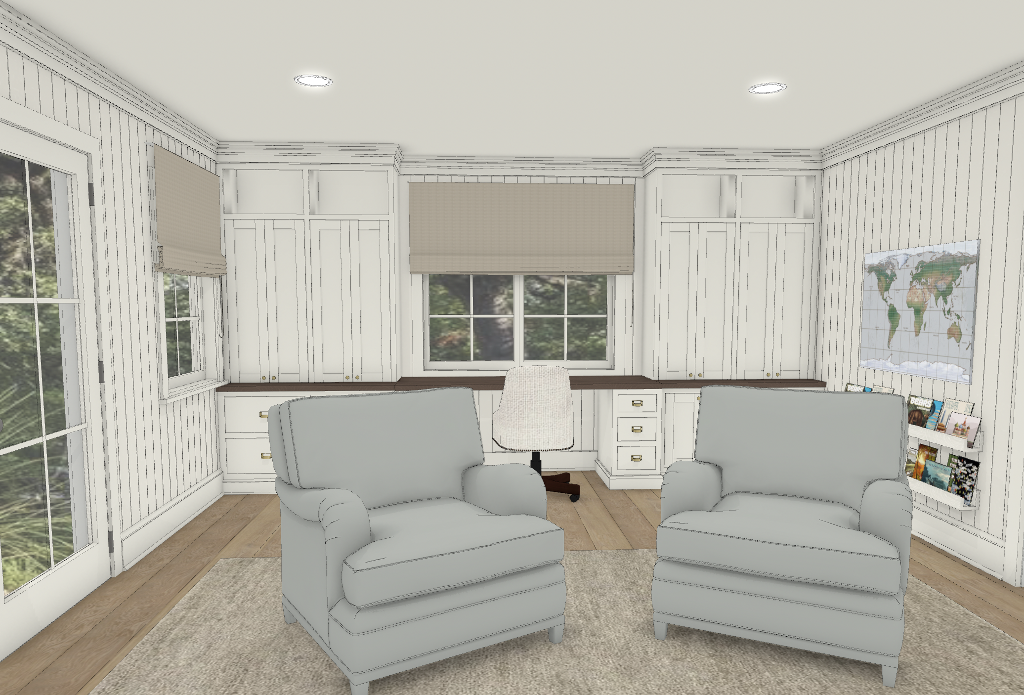 style this room like a playroom add toys to the shelving keep the chairs a light dusty pale blue do not add lighting to the shelving the toys should look like montessori toys no neon colors the rug should be a light neutral plaid with tans creams and greige colors