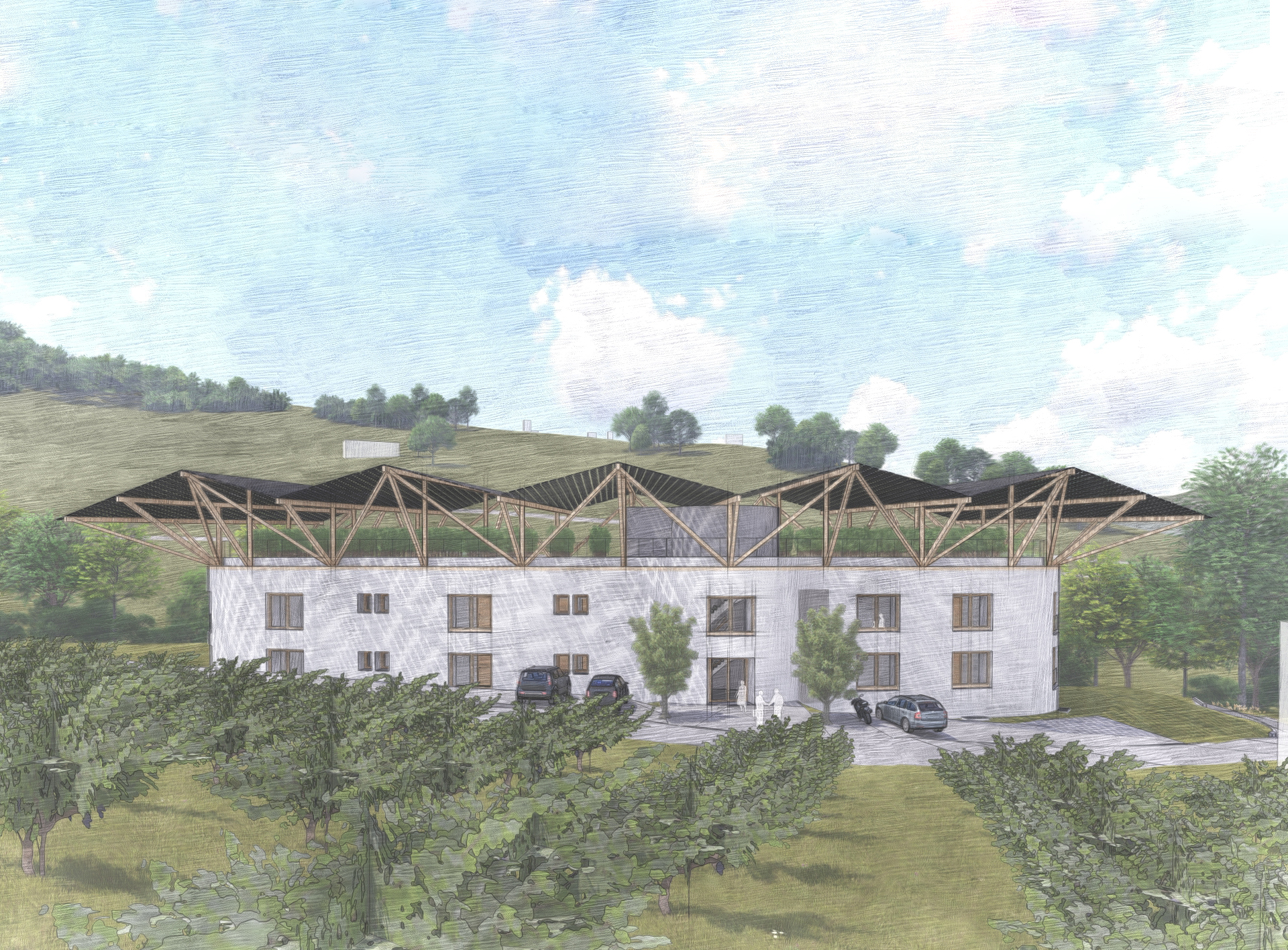 render a modern building with a curved uneven white lime facade and large wooden framed windows featuring a futuristic wooden roof structure with bifacial transparent solar panels in a crisscross pattern capture a lush surrounding landscape with vibrant green foliage and a hint of a serene blue stream the atmosphere should be bright and tranquil with dappled sunlight filtering through the trees casting soft shadows on the ground include a small terrace with wooden furniture and a lone figure gazing into the greenery wearing light colored attire