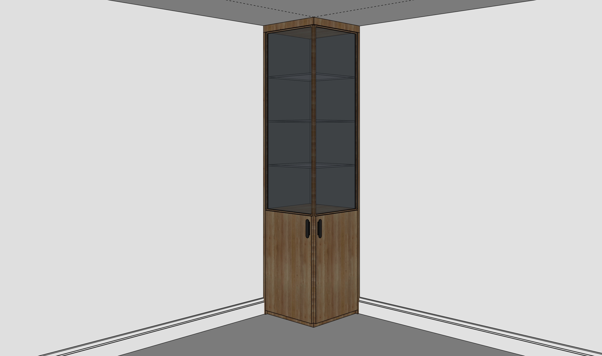 render this corner cabinet add led strip inside the shelfing inside is glass with a half glass half walnut wood finish add accessories inside