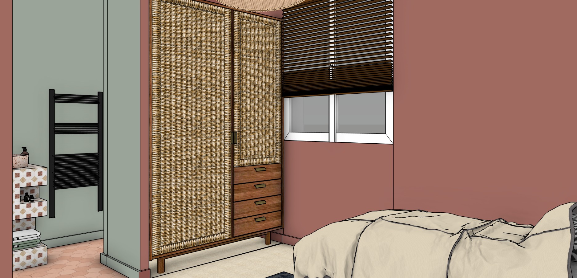 photorealist bedroom soft daylight the walls in the bedroom are dark pink and in the bathroom are blue greenish add more soft lighjt in the room