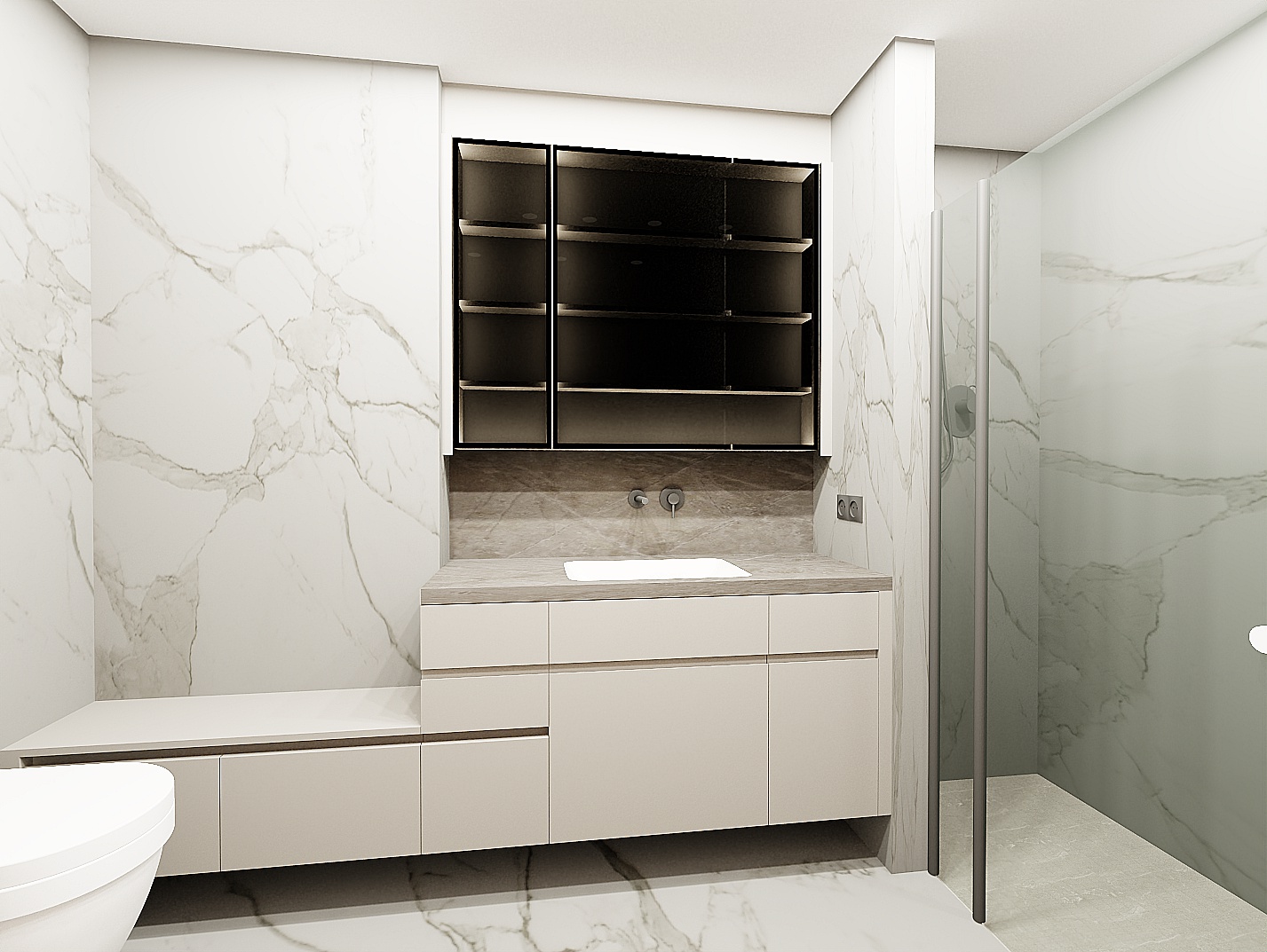 the upper cabinet shelves should be matte beige in color there should be led lighting under the upper cabinet