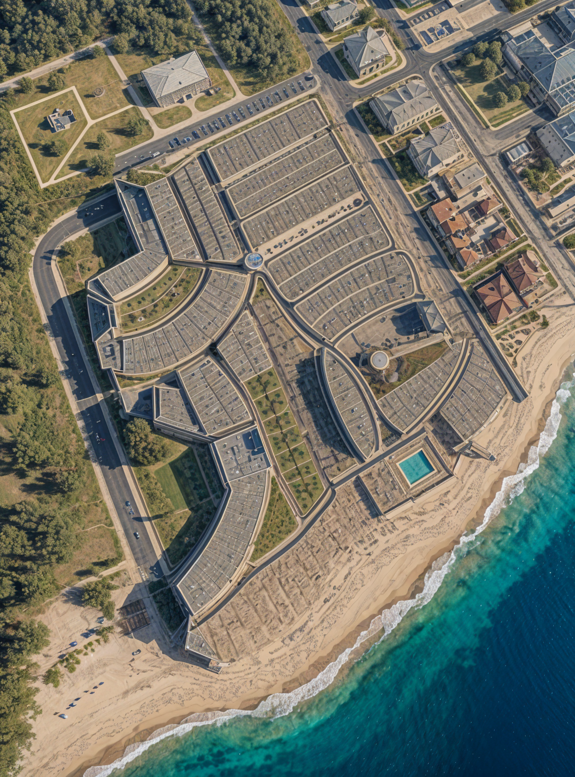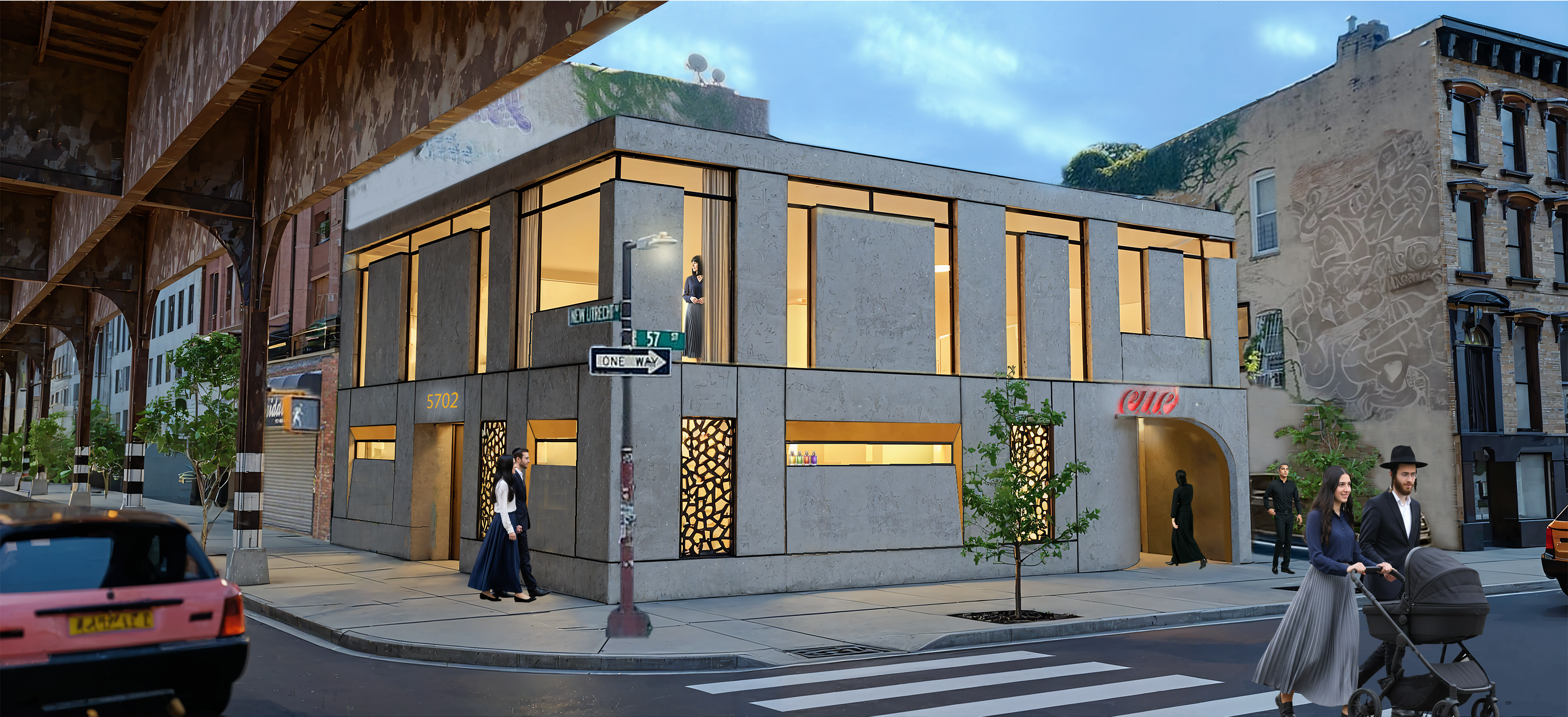 contemporary two story fa ade with smooth concrete panels in a pronounced grain texture bronze metal accents and elegant bronze lattice details large glass windows reveal a warm well lit interior urban brooklyn street under an elevated train line cinematic dusk atmosphere around 5 pm ultra photorealistic architectural render