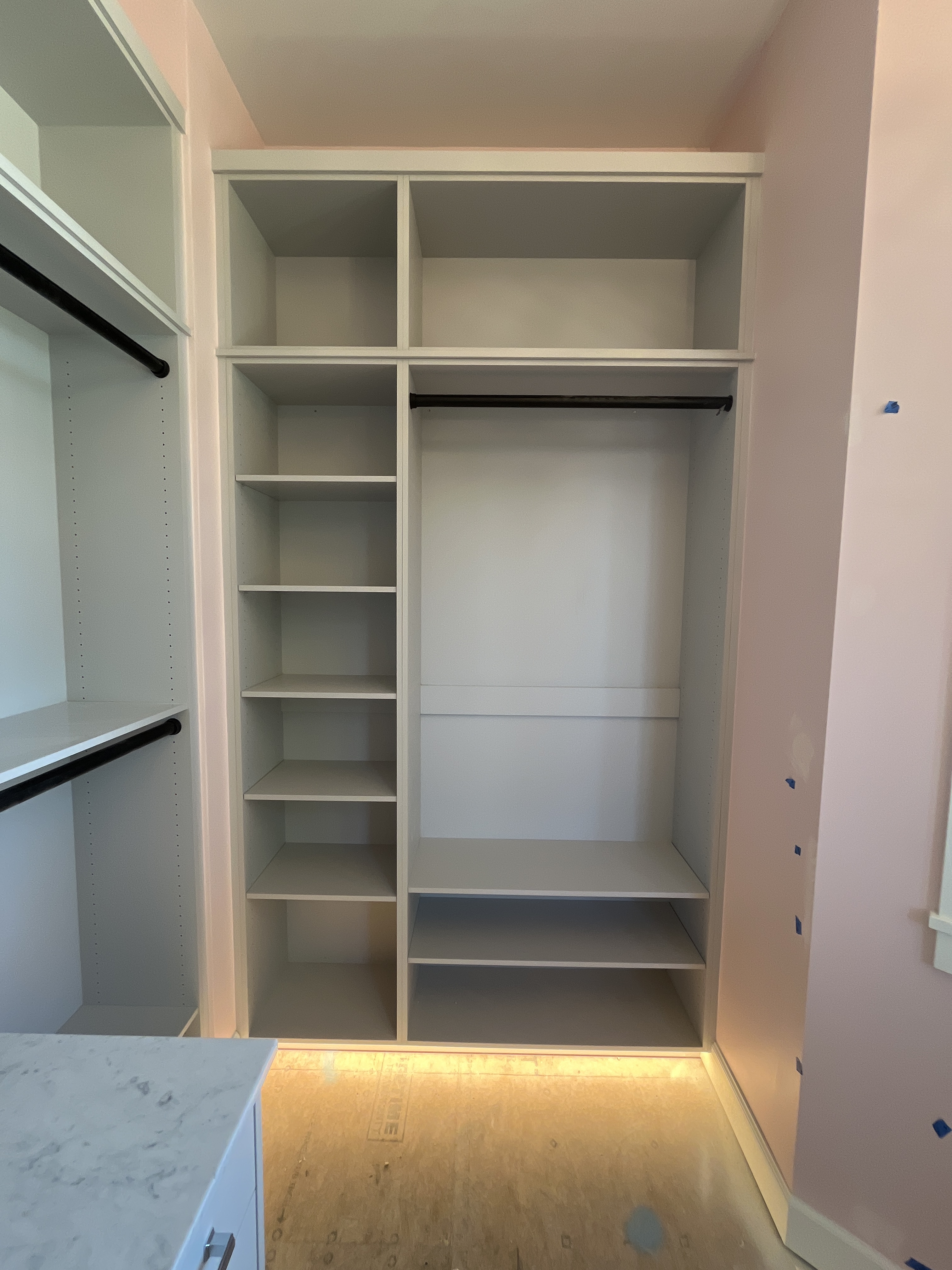 add carpet light the space style the shelves with folded clothes hang womens clothes on the rods remove blue tape from wall