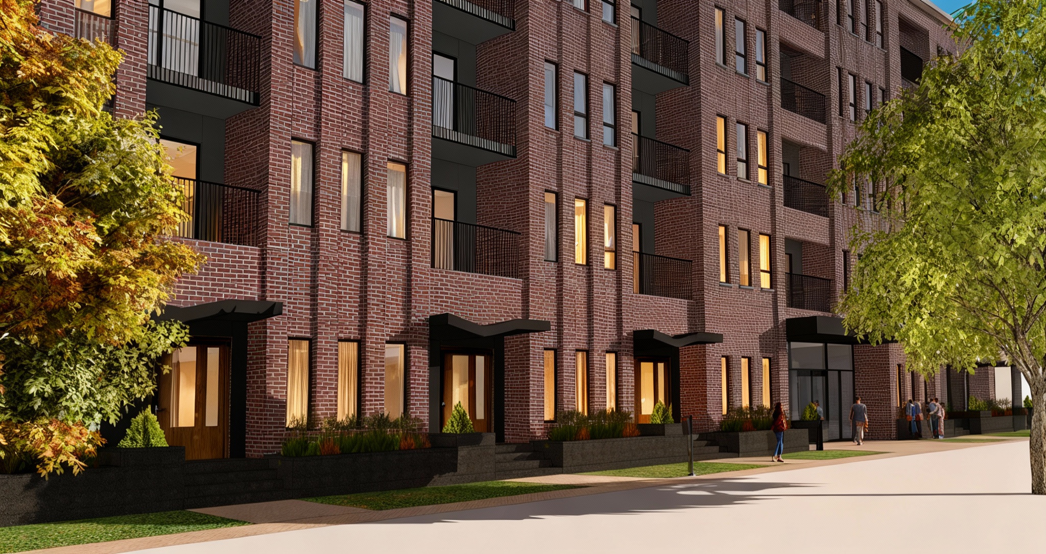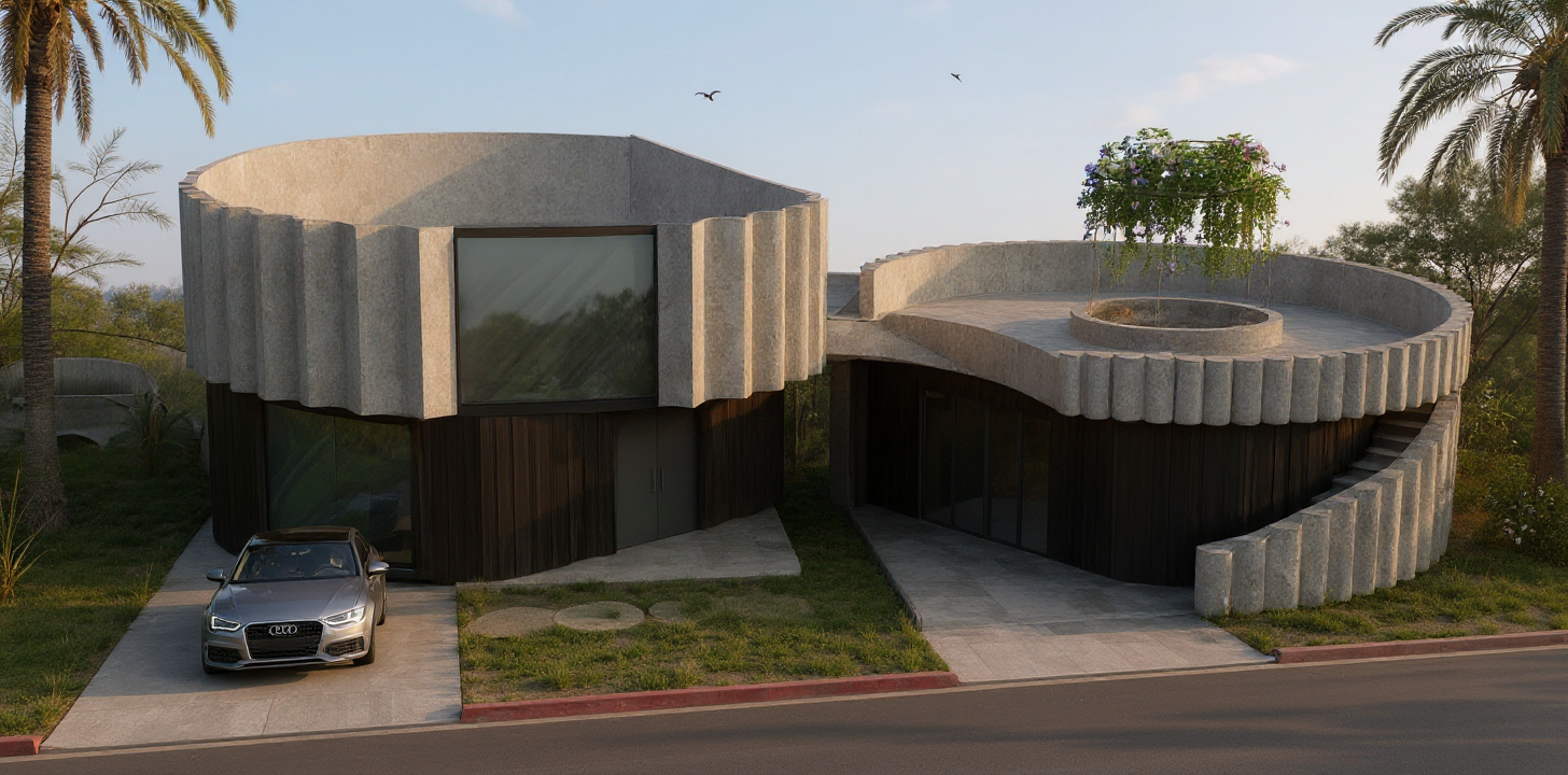 exterior shot using the first image as the exact geometric and camera reference render it into a fully realistic residential home that matches the material language lighting and realism of the second image maintain the same camera angle perspective proportions and massing as the first image do not rotate reframe or change viewpoint apply the same materials and finishes seen in the realistic reference ribbed concrete or stone cladding dark metal vertical fins at the lower level smooth curved upper volume realistic glass with reflections and subtle weathering set the project in los angeles with sunny clear skies warm afternoon light soft shadows and birds flying overhead add landscaping consistent with southern california low shrubs grasses palms include a modern car parked in the left parking lot only aligned with the site plan the building should read as a high end contemporary home photorealistic architectural visualization quality ultra detailed textures realistic scale natural lighting depth and atmosphere no abstraction no sketch lines no diagram colors photorealistic render only