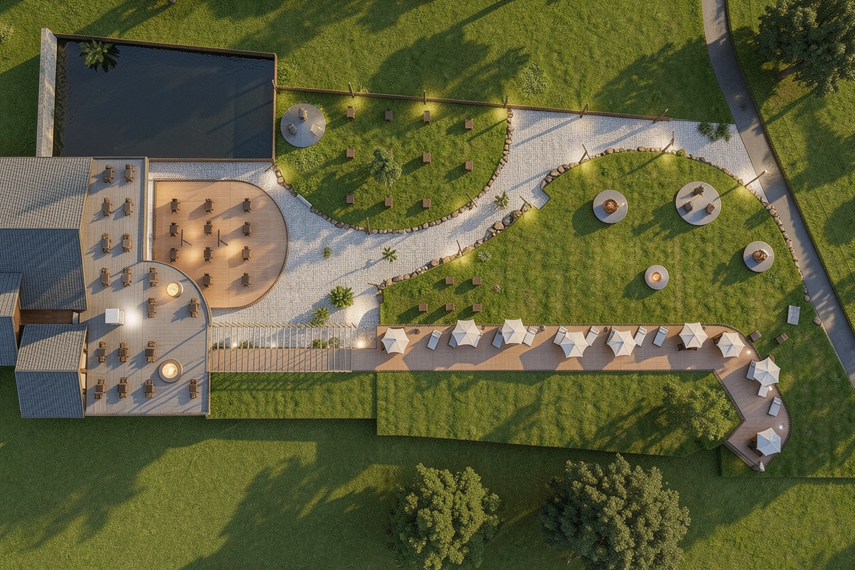 use this image as the base add a new structure in the right grass area the drop shaped lawn the one located in front of the long wooden deck with sun umbrellas position place the structure inside the right drop shaped lawn position it near the concave inner curve of the lawn keep clear distance from all walkways no contact with paved paths keep clear distance from the row of sun umbrellas on the wooden deck the structure must stay centered in the grass area without touching edges size and shape circular pavilion ombrella bar diameter 10 11 meters real scale clearly visible from above the structure must appear proportionate to the paths and furniture around it design dark oak wood frame dark grey fabric canopy removable tent style roof not a solid roof polygonal circular shape many sides approximating a circle fully glazed perimeter glass walls all around interior central circular bar inside no external furniture no elements outside the structure constraints do not modify existing paths grass shape deck umbrellas buildings or lighting do not change colors materials perspective or camera position only add the pavilion photorealistic aerial view