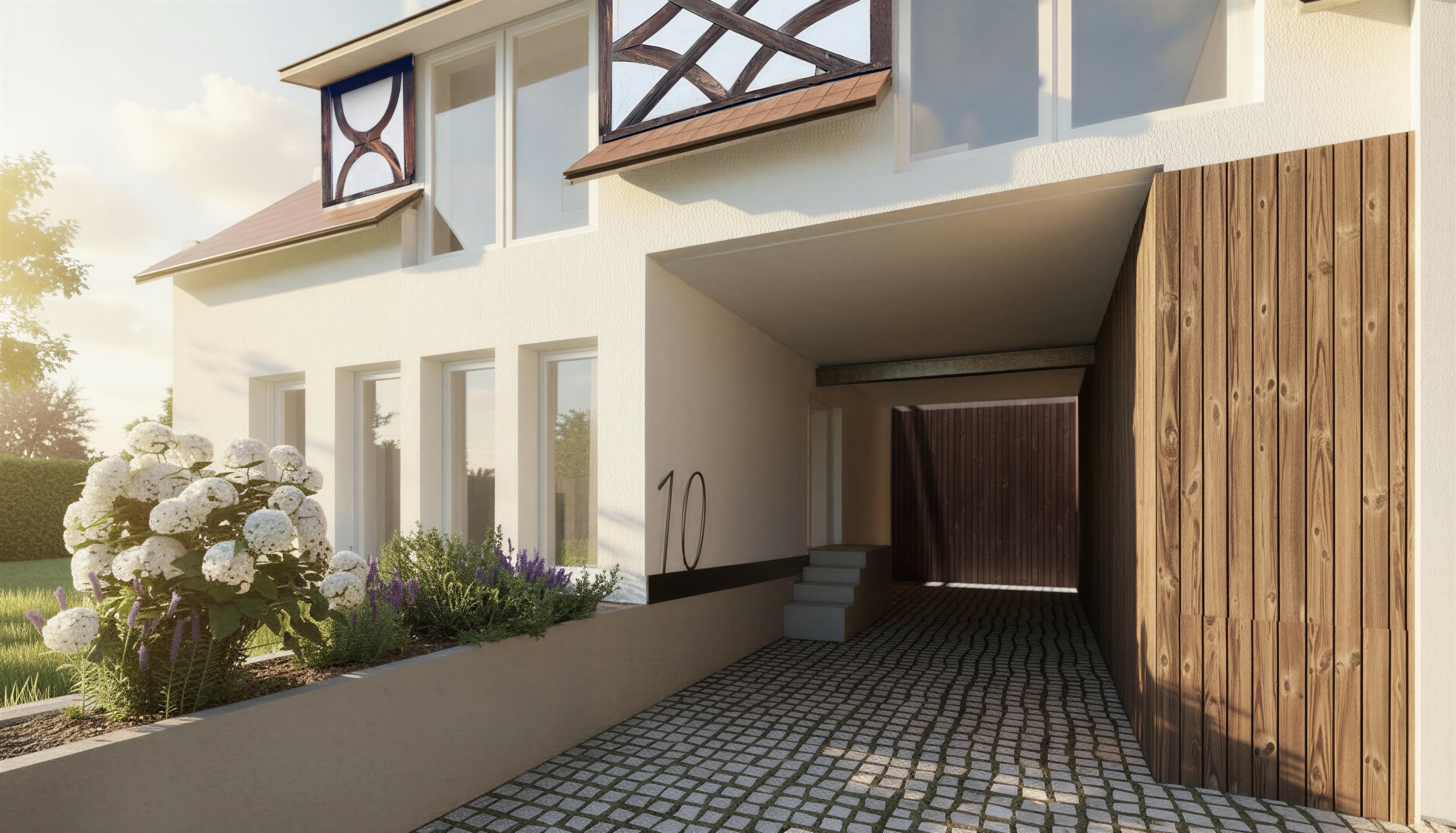 transform the facade materials while strictly preserving the existing geometry openings and proportions the white areas currently visible behind and around the wooden pattern should be treated as the main continuous facade surface not as recessed or interior surfaces they must read as part of the same exterior facade plane the wooden element should be integrated as a facade cladding feature applied onto the main facade not as a separate volume or deep recess ensure a clear hierarchy continuous plaster facade white as the primary surface wooden cladding as a precise flush or slightly articulated facade insert refine material transitions to be clean and architectural avoiding depth ambiguity natural light realistic shadows high end architectural visualization plain construction joints no lighting features at transitions