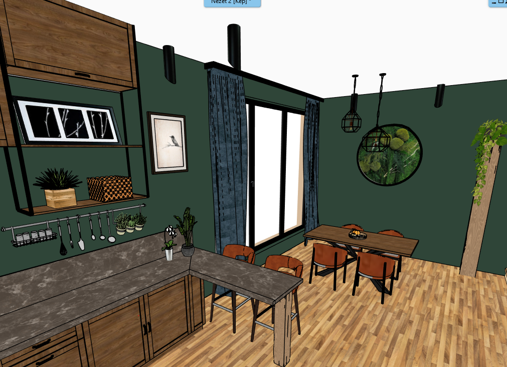 create a soft loft atmosphere the wall is dark green ral6005 the parquet is oak colored striped the dining chair and bar stools are also terracotta colored there are black metal framed lamps above the dining table with a light bulb in the middle behind the dining table there is a green plant decoration in a black circular frame on the wall a green leafy plant runs down from the wooden column the curtains are dark blue a little shiny we can see a big city through the windows the kitchen is also walnut colored with a gray brown marble countertop led strips light up the bottom of the shelves the spot lights beautifully illuminate the wall the picture has a soft bright cozy light show everything where it is in the picture