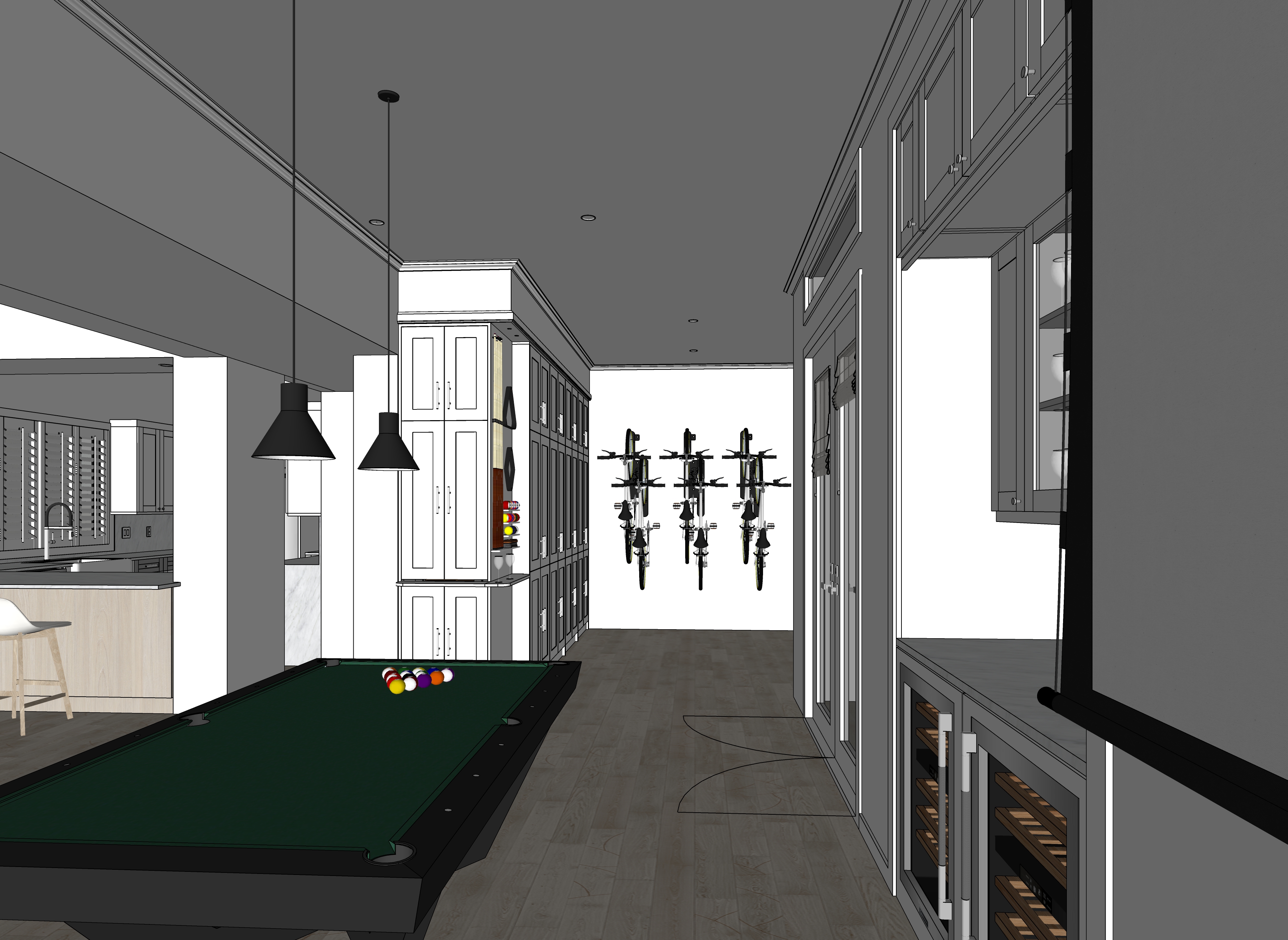 evening lighting in the space add lighting on the marble countertop add a man a playing a game of with a woman next to him waiting to take a shot with balls randomly arranged on the table keep the cabinets white like the source image the walls are painted white show a music video from kendrick lamar on the screen at the right side of the view bring the room light level down a little bit keep the light effect over the pool table