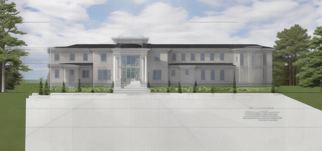 exterior shot white on white monumental style home with lots of precast trim details house is out of the ground about 6 with very formal stairs to grand main entry main entry is all clad with limestone window frames will be black and roof will be black house is in the woods with a small lake behind it there will be a long circular driveway coming from the left side of the property architecture