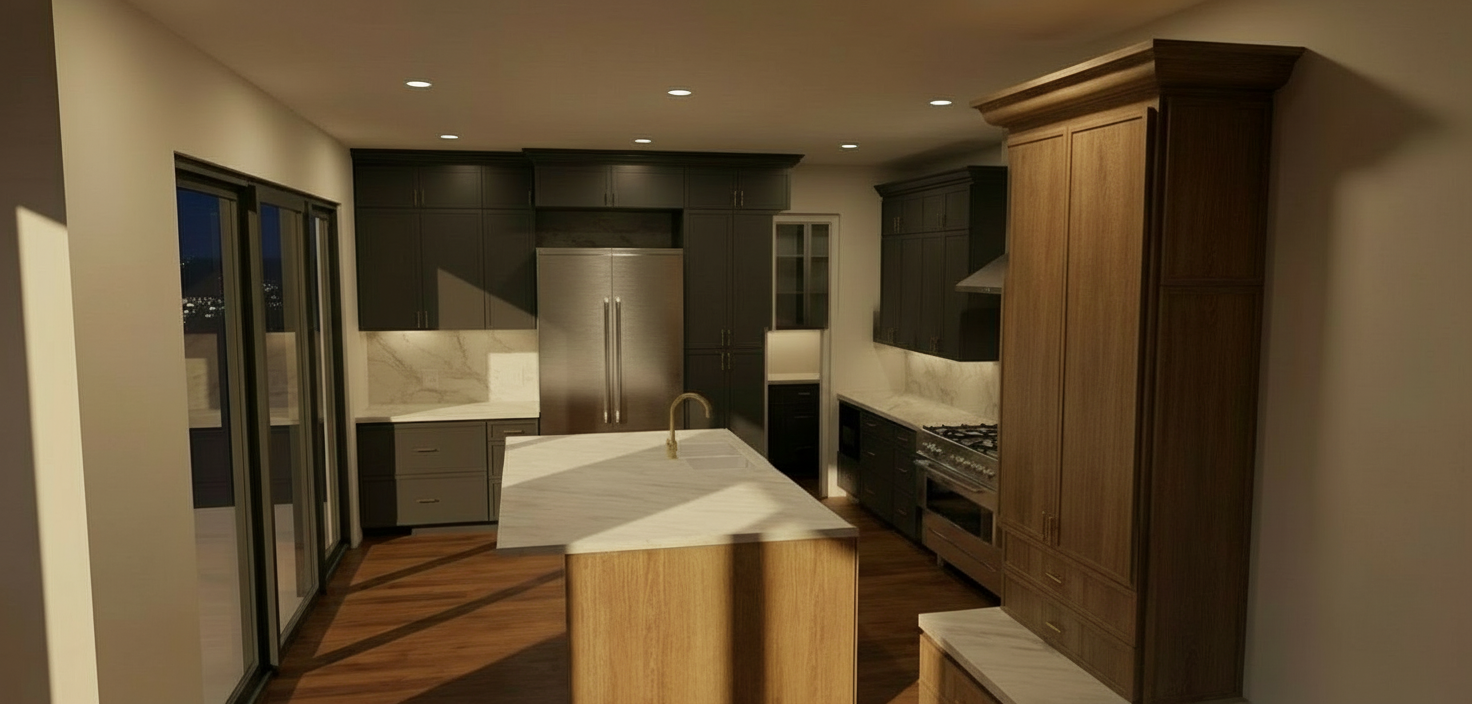 warm beige paneling with cedar siding on the parts that stick out warm grey stonework along the bottom of the house following the landscaping change the dirt road to one with pavers