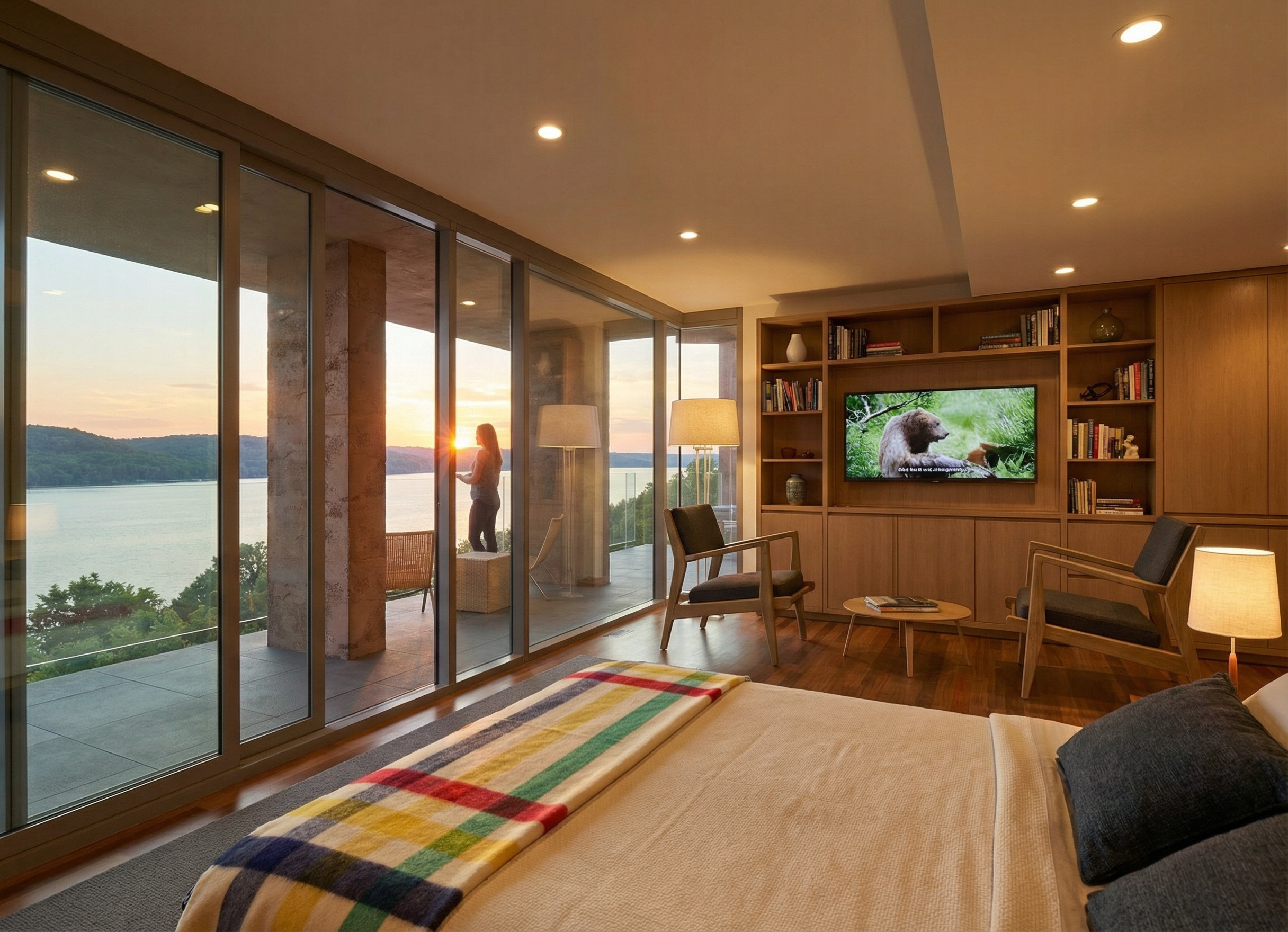 evening view in the summer with a setting sun on the horizon add light to the floor lamps and recessed lights make the view out of the windows of lake pepin from a high elevation with no trees visible below the balcony use site cast concrete for the main material of the columns with a natural warm clay color add books and other accessories to the shelves ad an image on the flat screen of a nature movie add a woman standing on the balcony looking out towards the view with a cat sitting next to her add a hudson bay blanket draped over the foot of the bed add a man sitting in the chair on the right reading a book add led linear lights to the shelves add two sailboats on the lake