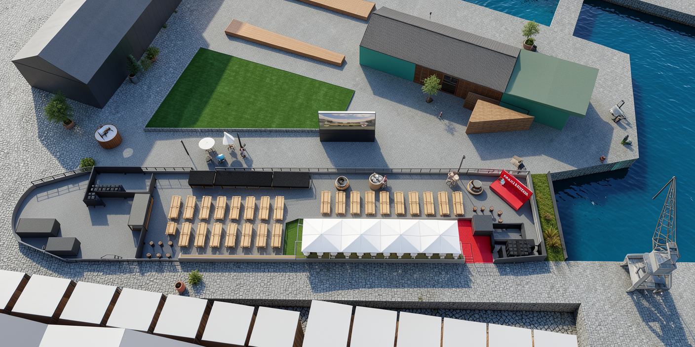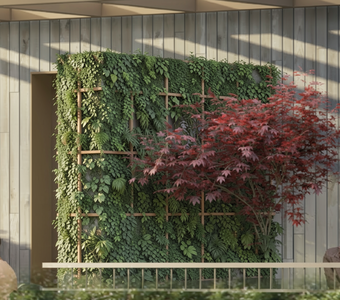 wide angle shot a modern outdoor terrace with a minimalist design the scene is set during sunset creating a warm and inviting atmosphere the floor and walls are a soft light gray adding a contemporary touch the pergola is made of natural wood with a warm earthy brown color surrounding plants are lush and green providing a vibrant contrast the ceiling is a sleek charcoal gray furniture consists of wooden tables and chairs with a rich dark oak finish the ambiance is serene with soft golden light streaming in casting gentle shadows and highlighting the textures of the materials