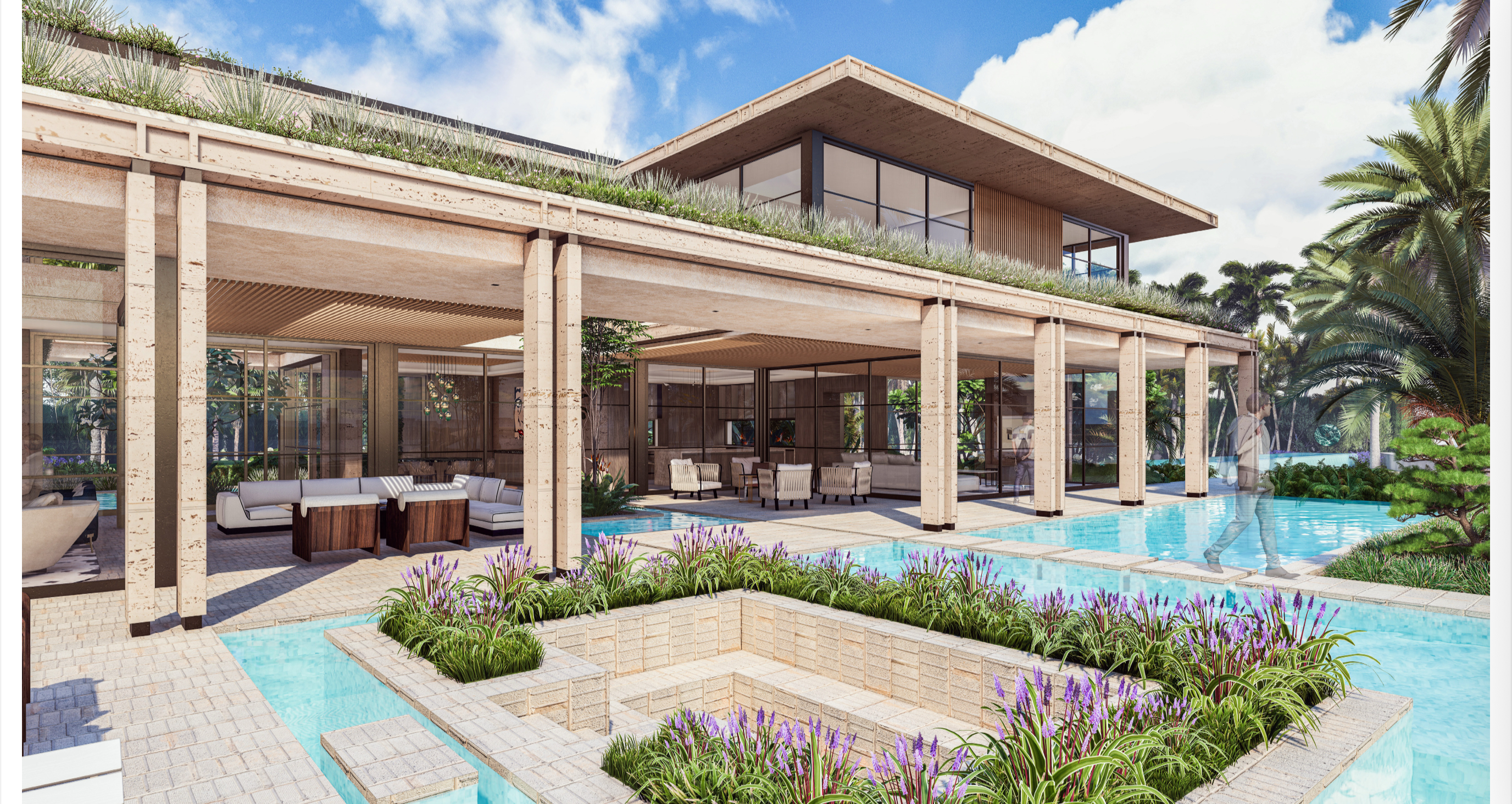 add some light grey timber to the underside of the ceilings in this render and so make the stone a smooth and less textured finish make the time of day early evening and add uplighting to the building add uplighting to the columns