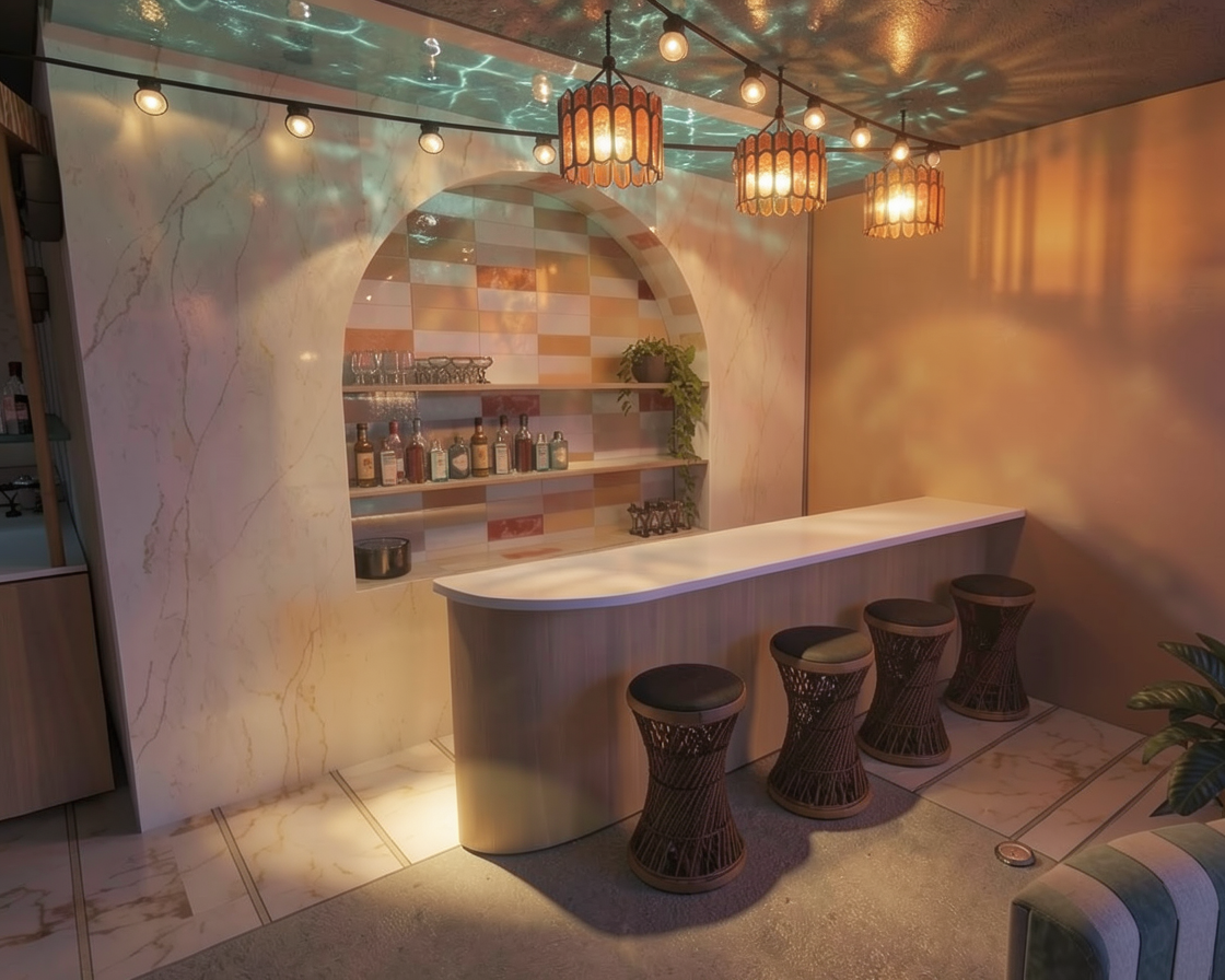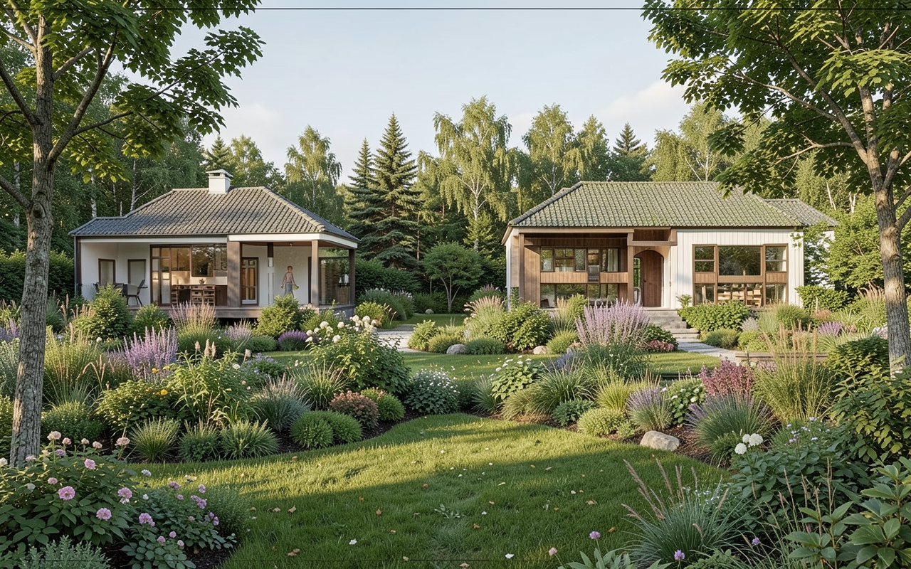 render a rustic two story lodge with a dark charcoal facade the roof and balcony railings are in matte black add a warm glow from the amber lighting around the entrance surround the building with lush vibrant green grass and dense trees in various shades of green the sky is a bright clear blue with a few wispy clouds creating a serene atmosphere