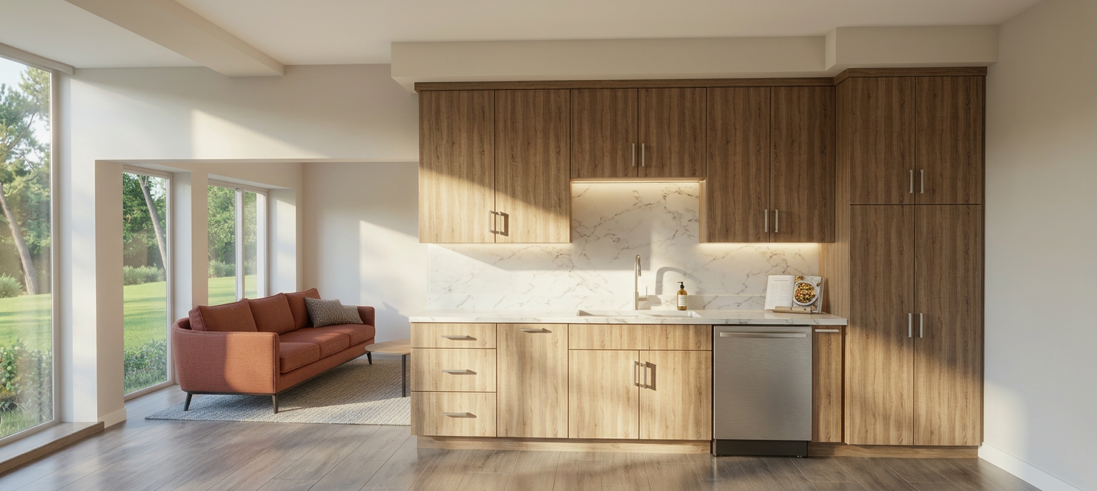 modernist exterior shot enhance the existing architectural rendering while strictly maintaining the original camera position perspective framing and composition do not alter the geometry proportions or design of the building create a calm high end photorealistic visualization that conveys a refined and professional atmosphere the image should feel natural balanced and realistic as if captured with professional architectural photography use soft natural daylight with realistic global illumination subtle shadows and accurate material reflections improve material quality with highly detailed physically accurate textures concrete glass metal wood etc ensuring correct roughness reflections and depth glass should have realistic transparency and subtle reflections surfaces should show slight natural imperfections to avoid a cgi look refine lighting and color grading to achieve a harmonious warm and inviting mood without becoming dramatic or over stylized avoid exaggerated contrast or artificial effects the atmosphere should feel calm and sophisticated enhance environmental details landscape sky vegetation people if present to support realism while keeping the focus on the architecture add subtle depth of field only if appropriate maintaining sharpness on the building the final result should look like a premium real estate marketing visualization elegant realistic and professionally presented architecture