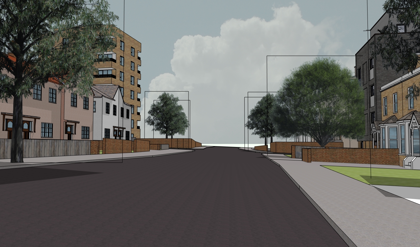 london street scene with cars people and blue sky