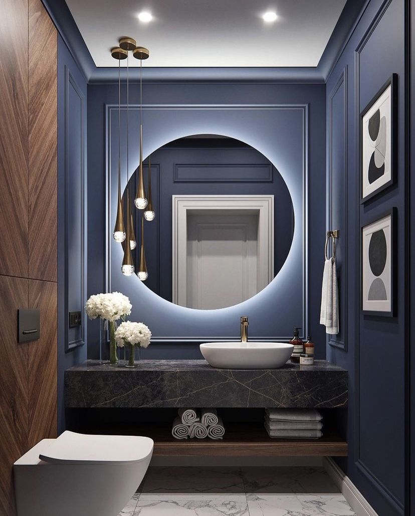 exterior shot a high end 3d architectural interior of a luxury dressing powder room to the left a wall mounted white toilet is situated below a floor to ceiling built in wardrobe the wardrobe features seamless double doors with a warm vertical chevron wood grain finish the walls are finished in a deep navy blue with elegant classical moldings on the right a floating dark charcoal marble vanity with gold veining holds a white vessel sink and a gold faucet above the vanity is a large circular back lit mirror to the side of the mirror a cluster of thin gold pendant lights hangs at varying heights the floor is white marble with soft grey veining moody atmospheric lighting with recessed ceiling spots ultra realistic 8k interior design photography style