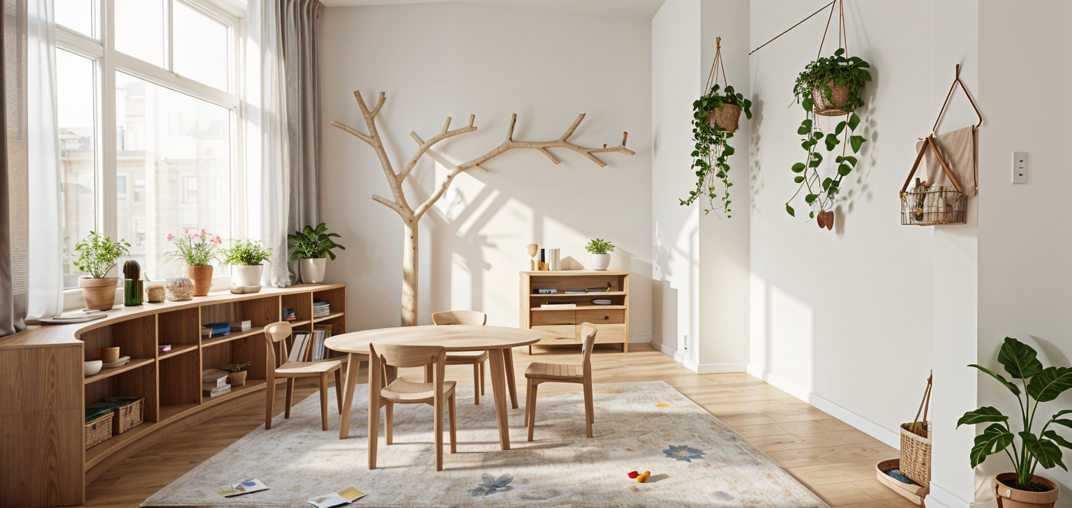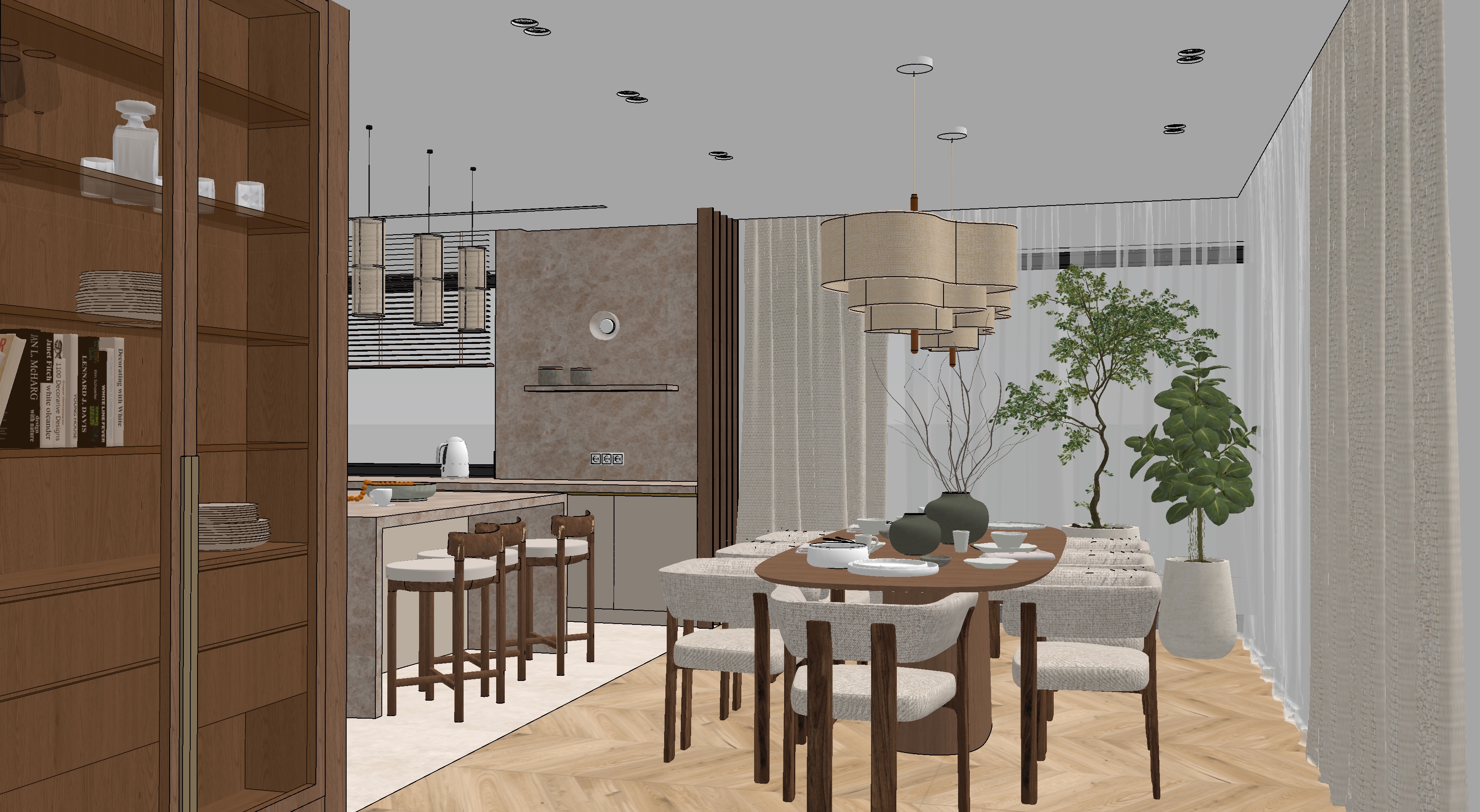 the kitchen cabinets are beige the glass in the display cabinet is brown above the shelf in the kitchen there is a wall lamp