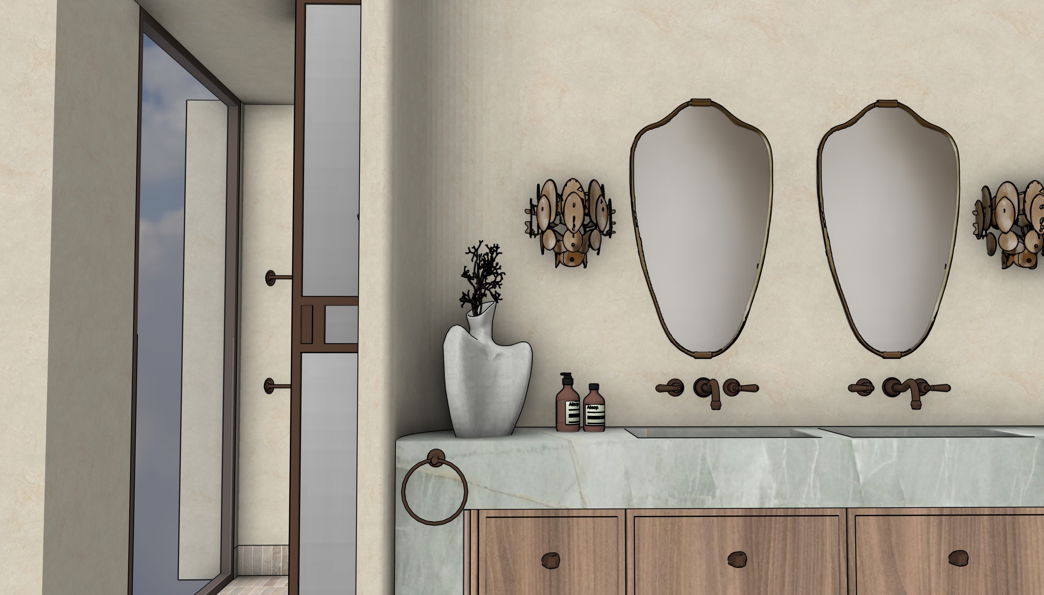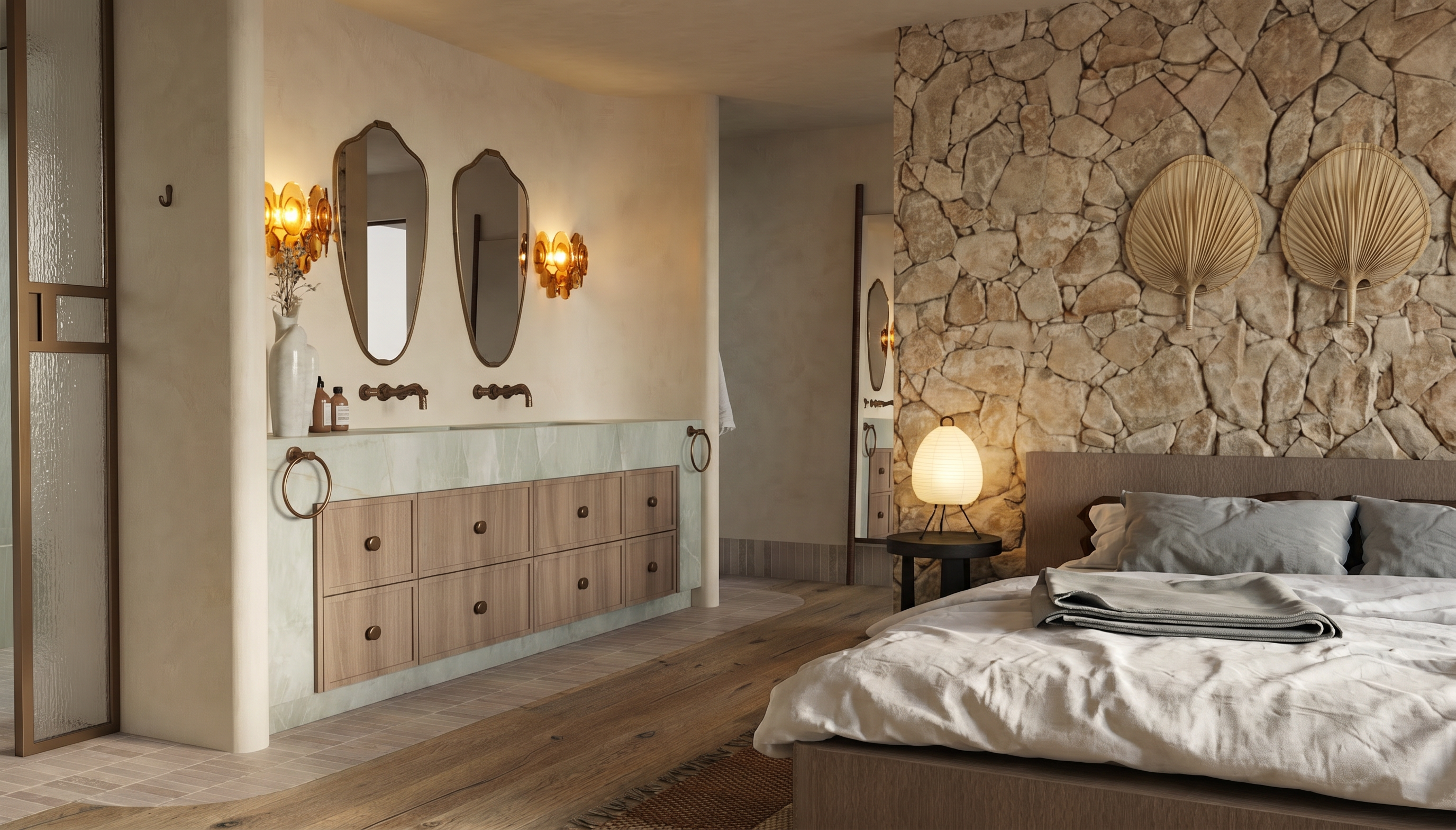 walls and ceiling are warm off white limewash vanity stone is soft muted light emerald quartzite vanity cabinetry is a soft muted mid tone timber not dark not light bed head wall is a freeform stone cladding glass door is bronze frame with flemished textured glass insert moody lighting golden hour turn bedside lamps and wall sconces on bedside lamps are rice paper wall sconces are an amber toned murano glass