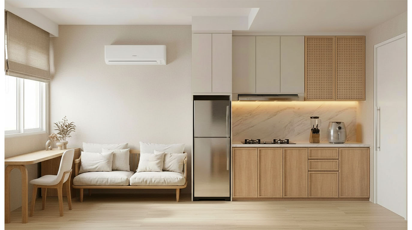 ganti warna fabric sofa dan kursi jadi soft beige agak keabuan tanpa merubah renderan yang lain