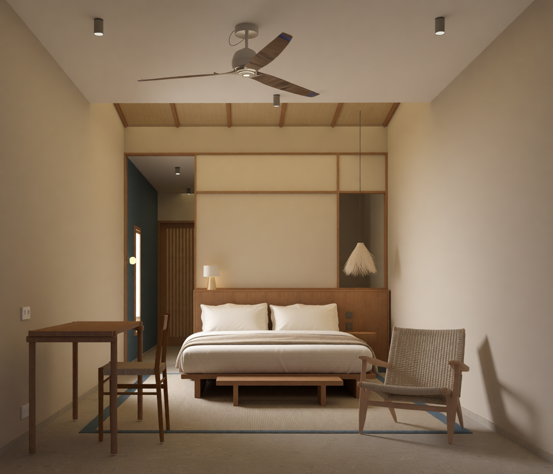 maintain the existing design exactly as it is do not add windows no changes to geometry layout materials furniture or colors introduce daylight coming from the very big front sliding window doors at the back the room aligned with the observer s viewpoint the light should be diffused soft and realistic filling the room with gentle brightness and creating subtle shadows do not add windows or modify the wall structure in any way enhance realism through accurate light behavior global illumination and soft shadow transitions from the front artificial lighting can remain off or very subtle keep the existing atmosphere calm and natural no other changes to the scene preserve original design intent completely do not modify the room s structure