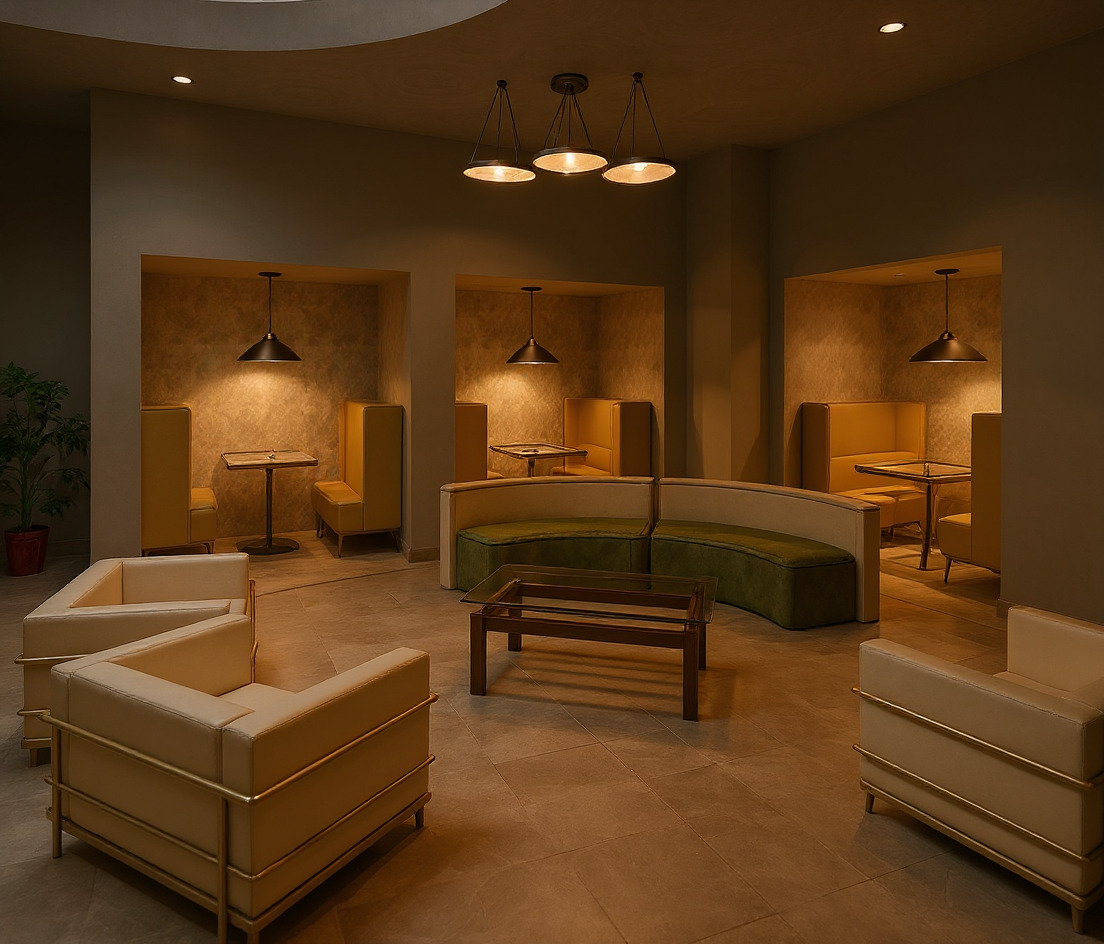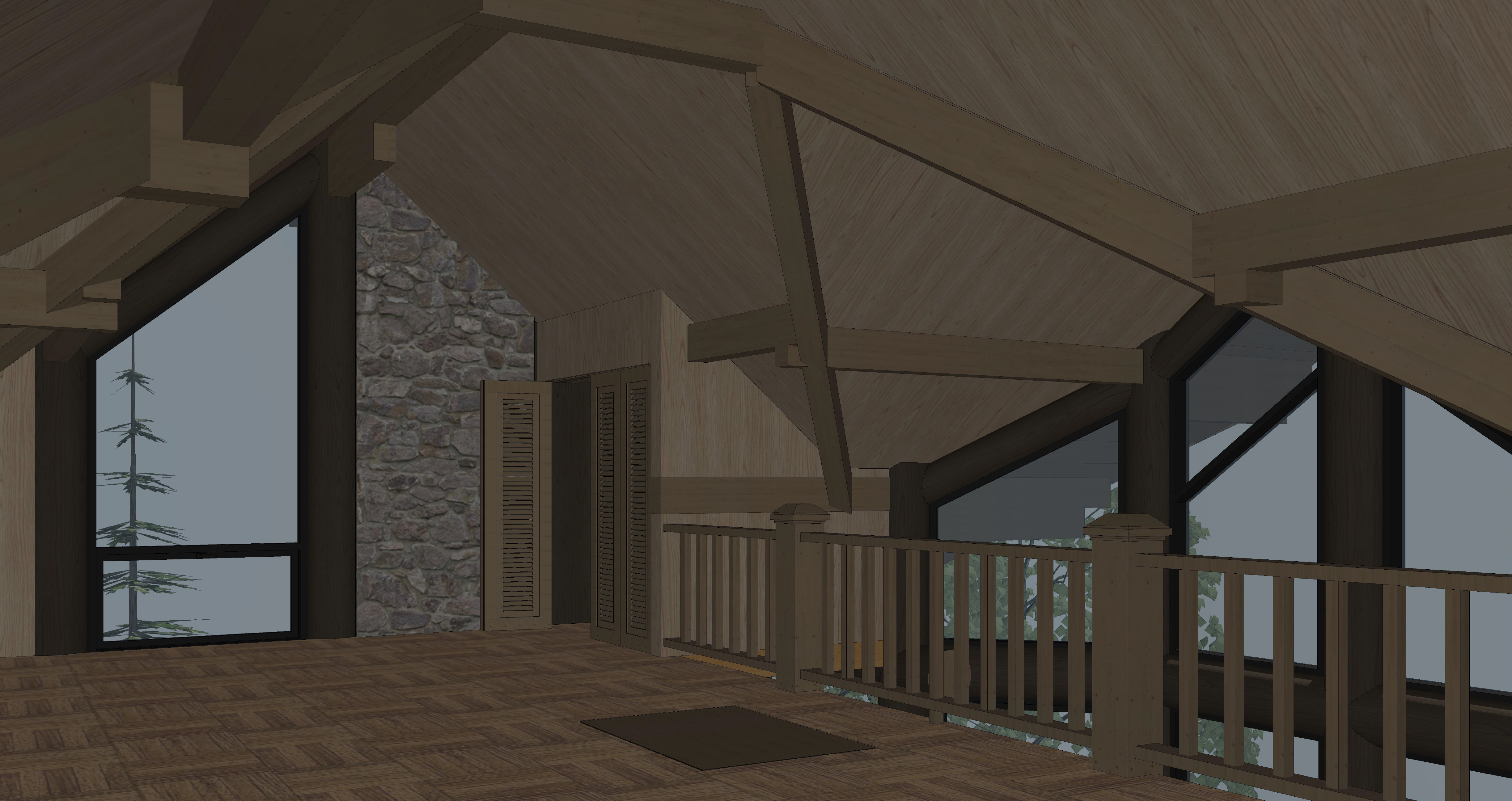 render a cozy nordic interior rustic wooden ceilings and beams in warm tones the view through the large triangular windows showcases a serene summer landscape with evergreen trees use soft ambient lighting to create a comfortable and inviting atmosphere the stone wall should exhibit textured gray rustic stones while the wooden floor features an intricate laminate pattern in a rich walnut hue incorporate subtle shadows for depth and realism render in hyper realistic architectural visualization quality 8k resolution