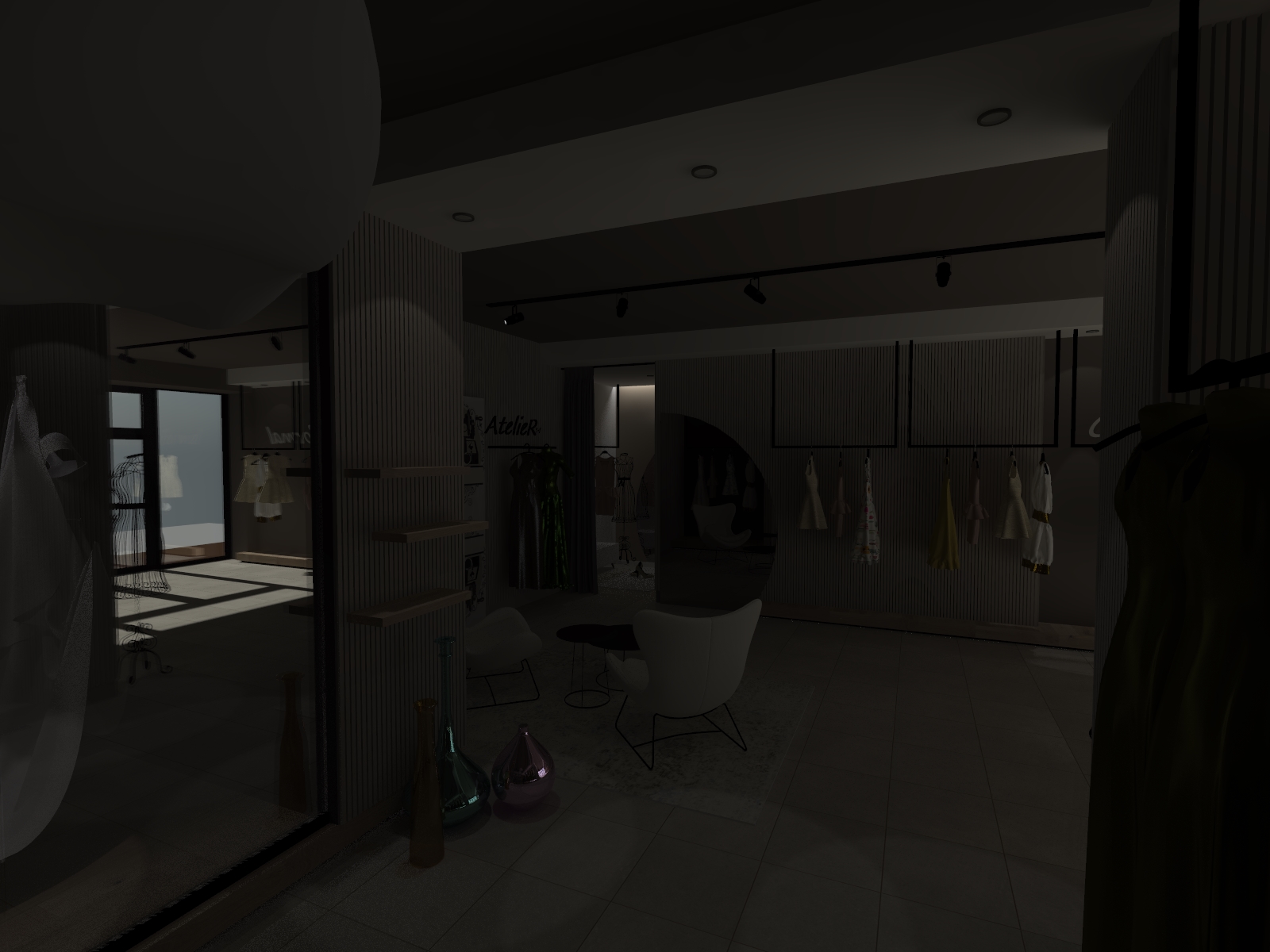 enhance the realism of this architectural rendering by improving lighting and shadows material and texture quality atmospheric depth and human scale elements focus strictly on photorealistic refinement of what is already present in the image do not add remove or invent any architectural elements furniture vegetation people or objects that are not already visible add just some more dresses and enhance the existing ones preserve the original design intent spatial composition color palette and layout exactly as provided apply these enhancements naturally across interior spaces as present in the image shadows should feel physically accurate materials should read as real world surfaces the atmosphere should convey a believable time of day and environment and any human scale references should appear natural and contextually appropriate put a soft warm light coming from underneath of the wooded platforms on the floor put a soft warm light from behind the mirror do not hallucinate or introduce new elements add some more dresses and enhance the dresses that already what exist