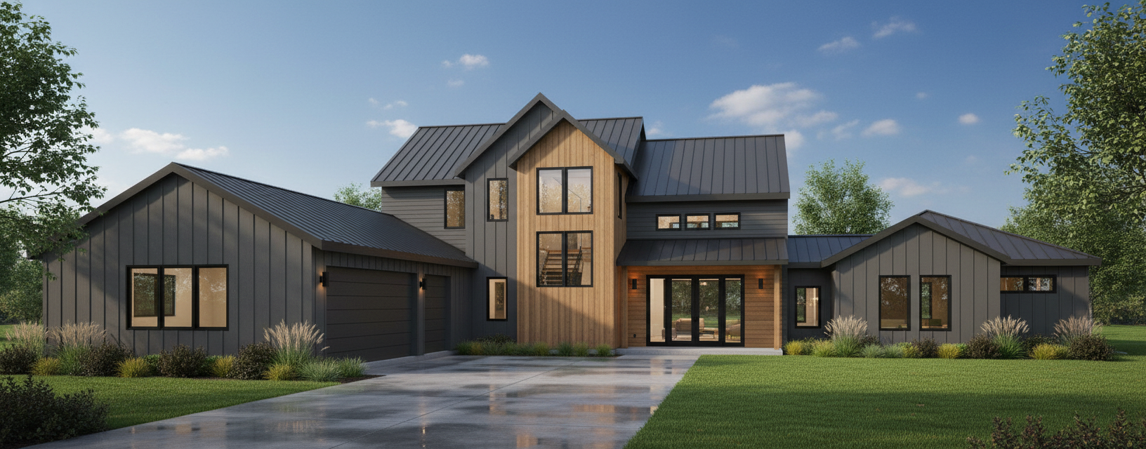 can you recreate this into a beautiful realistic photograph the creamy part is a white washed brick the vertical is a light wood siding the white is a creamy stucco the facia is cream the roof is a medium brown