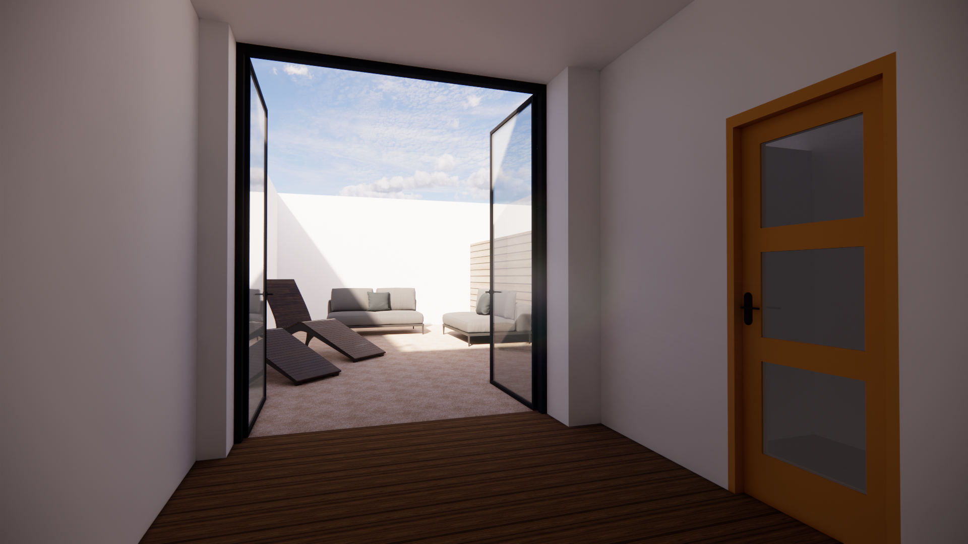 modern bedroom with doors opening up to yard with seating area and greenery bed across the door the flat is in athens greece modern abstract artwork above bed hidden led lights on the ceiling floor tiles 1 20x1 20 stone beige