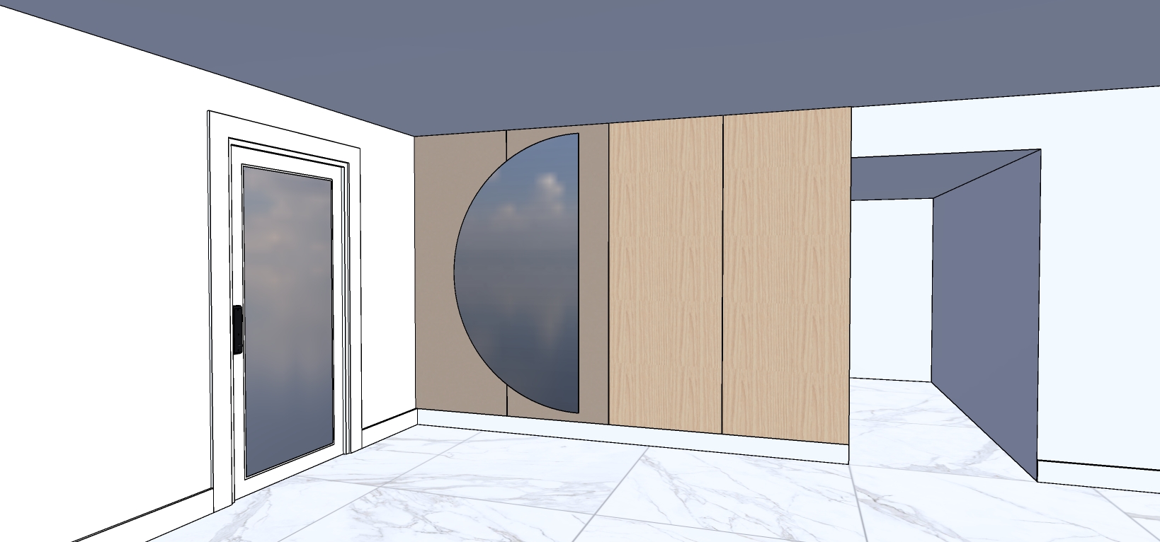 create a photorealistic interior render based on the uploaded image keep the original layout proportions and architectural elements unchanged the overall aesthetic must feel bright clean and modern luxury color wall control important all walls must remain pure white matte pure white plaster finish no color tinting no gray or warm discoloration smooth clean surface almost no texture maintain a bright white interior environment high brightness exposure airy clean lighting no dark or moody color grading door details keep the door fully white white door panel white door frame white trim and casing the center glass must be frosted glass soft translucent frosted finish light diffusion effect subtle glow when light hits it add design elements add a floating wall mounted cabinet intersecting the mirror minimalist thin modern soft neutral wood or very light finish elegant overlap with the mirror add a minimal linear chandelier slim tubular design modern and simple warm white light 3000k lightweight and elegant add a small decorative bench under the cabinet minimal modern bench neutral tones refined and not bulky floor material use high gloss polished marble flooring white marble with subtle gray veins mirror like glossy reflections clean luxury finish reflect chandelier and surroundings softly render style bright luxury interior lighting soft global illumination clean whites no yellowing no dark mood subtle realistic reflections high end architectural visualization style important restrictions do not change layout or architecture do not recolor walls keep the mirror shape and wood panel placement maintain original composition