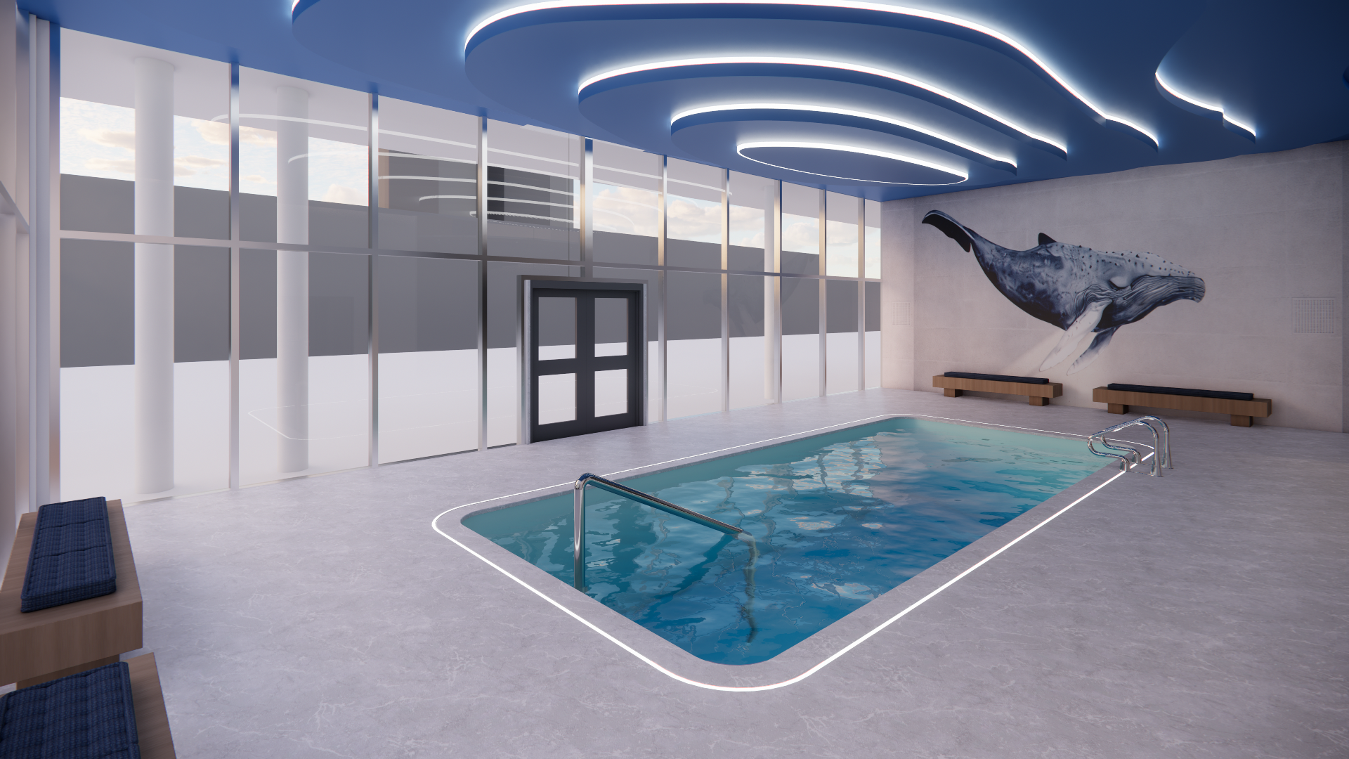 render this realistically on the first floor and add buildings outside make the blue on the ceiling a navy blue