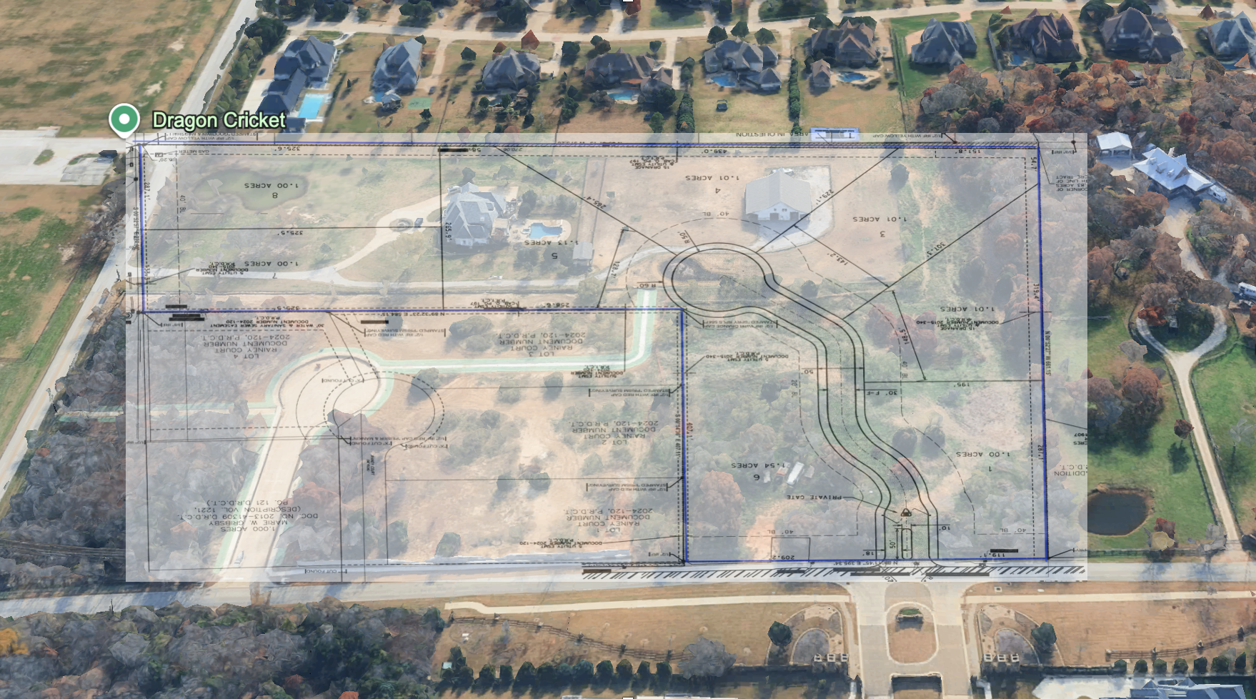 transform this aerial image into a photorealistic luxury residential subdivision i want to see the 8 lots in the blue flag shaped lot section 2 lots on the left and 6 lots in the cul de sac section remove all existing man made structures including houses barns driveways sheds and any existing improvements replace with clean natural terrain native grass and preserved mature trees maintain the exact subdivision layout shown in the overlay curved private road cul de sac geometry and 8 one acre lot configuration roads should appear newly constructed with clean asphalt and concrete curbs boundaries with generous set include long private driveways manicured lawns ornamental landscaping and subtle fencing where appropriate preserve existing mature trees throughout the site with selective clearing around homes and roads to maintain a natural estate feel add a premium gated entrance at the main road with stone columns iron gates and a landscaped entry feature maintain natural topography with gentle slopes and drainage areas lighting should be cinematic golden hour with soft shadows camera angle should be slightly angled aerial not top down showcasing depth road curvature and lot layout ultra realistic highly detailed textures 8k quality photorealistic rendering