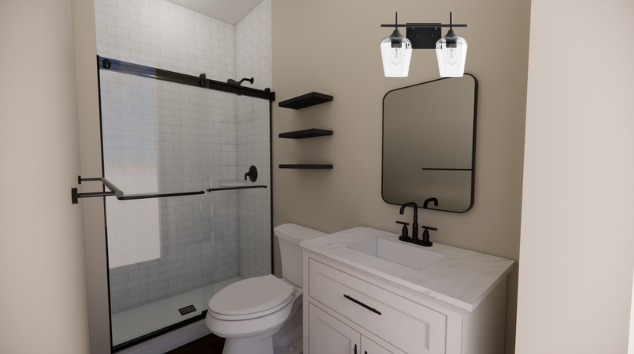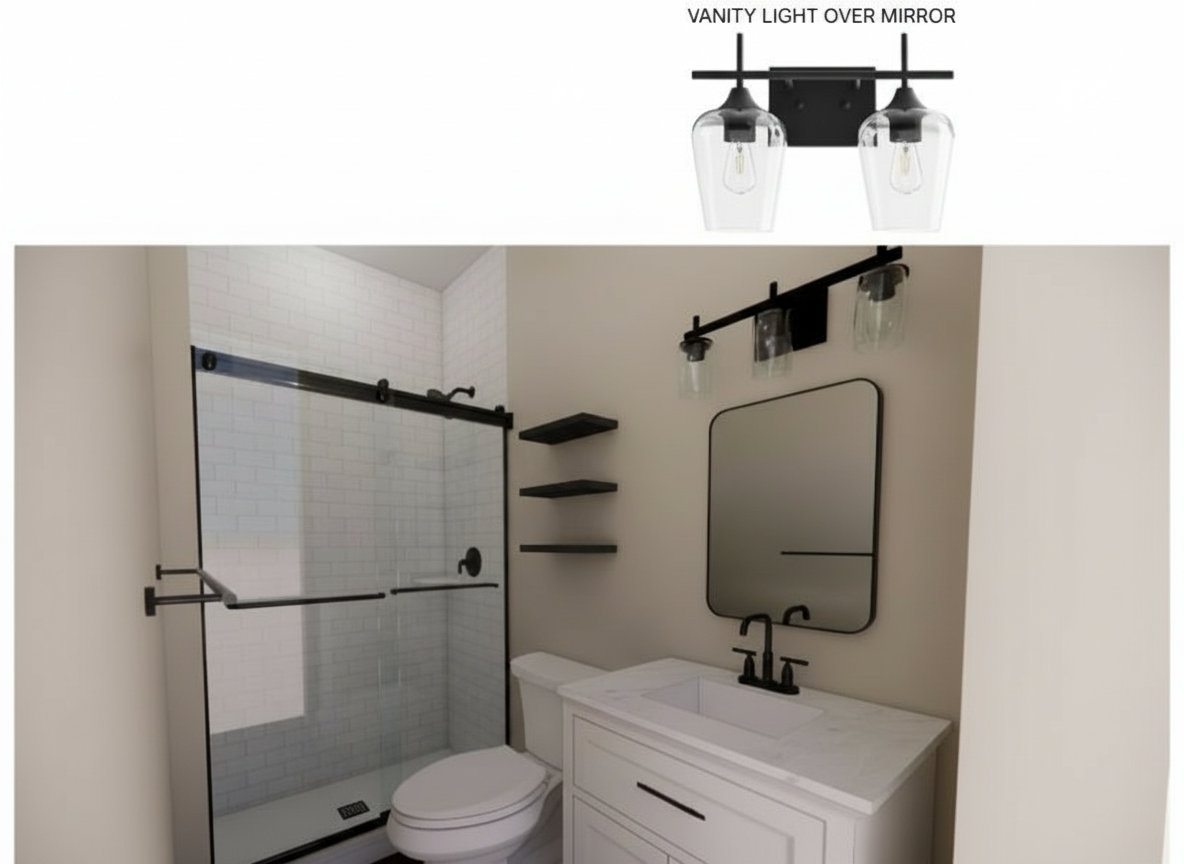 keep everything exactly the same in the rendering do not change the layout walls shower glass tile vanity mirror faucet toilet shelves colors materials or camera angle only add the vanity light shown in the reference image above the mirror vanity light specifications black metal fixture two clear glass shades horizontal bar mounted centered above the mirror correct scale and proportion to the mirror and vanity the light should look physically attached to the wall make the rendering look more realistic and like a real photograph natural lighting soft shadows realistic reflections on glass and mirror realistic materials and textures slight imperfections for realism correct light glow from the fixture global illumination ambient occlusion photorealistic rendering do not change bathroom layout tile vanity mirror plumbing fixtures shelves colors materials the only change should be adding the vanity light and increasing realism