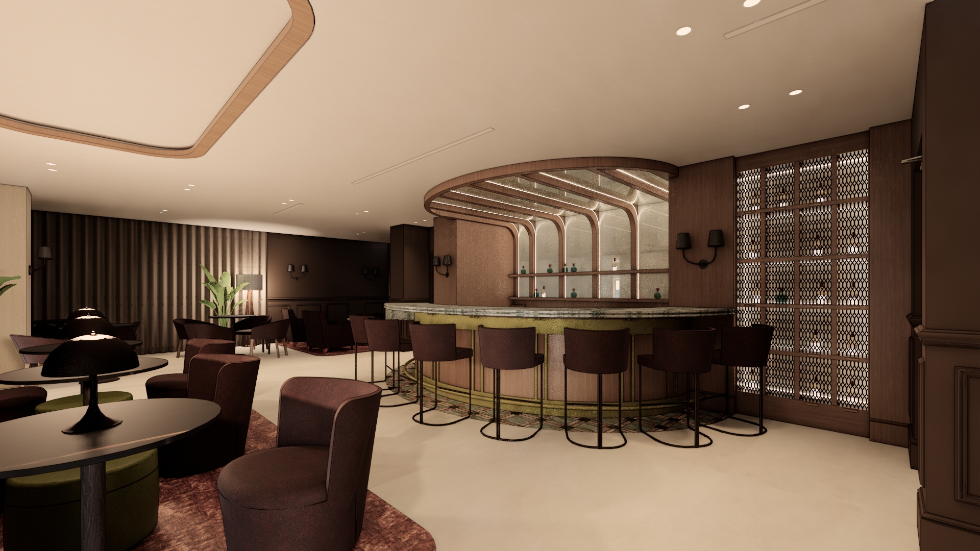 add one bartender behind the bar preparing drinks and interacting naturally while preserving the bar s structure and alignment stools should appear upholstered in brown leather with subtle natural sheen and cushioned tactile texture include executive guests seated at the bar add premium alcohol bottles arranged tastefully to bar shelves keep all materials as they are