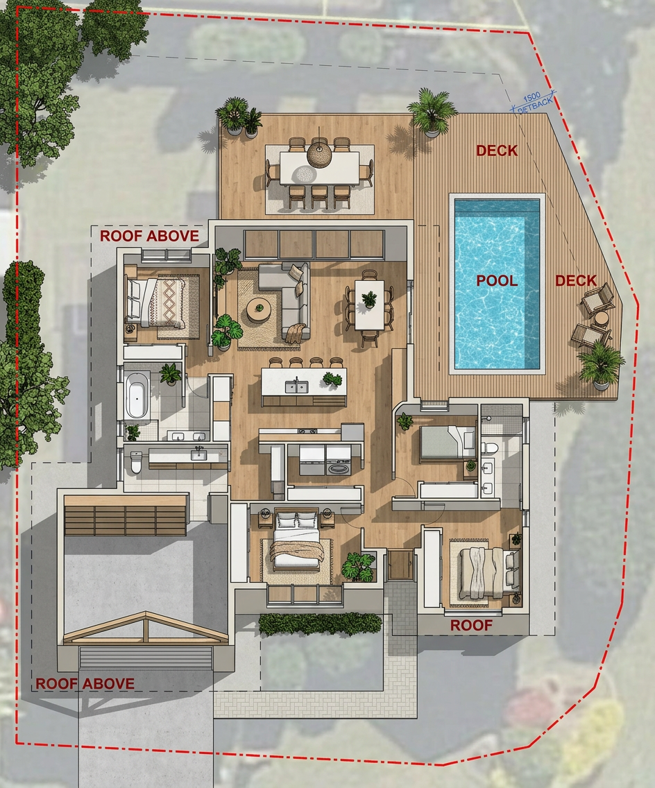preserve the base image no terrain changes do not modify terrain fencing or the background insert new house image only do not add land from reference images house to remain exactly as provided do not enhance house match perspective lighting and scale