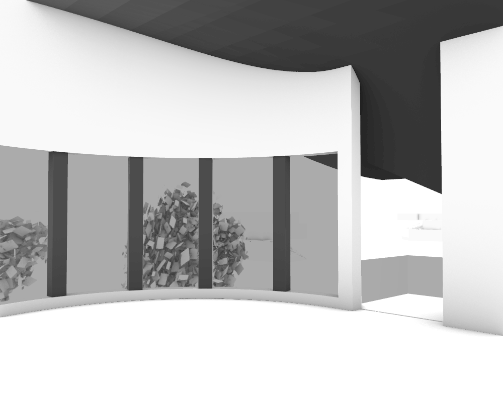 use the exact geometry from the input image do not alter simplify or reinterpret any of the architectural forms curves openings or proportions this includes the curved wall curved glazing black steel window mullions door opening on the right ceiling shape and floor edges render everything exactly as modeled only change the rendering style rendering style soft watercolor architectural rendering gentle shading and minimal linework image edges fade bleed into white like watercolor on paper not photorealistic soft diffused interior lighting materials applied to existing geometry only black steel framed windows keep mullions in the exact same positions polished concrete floor topping smooth light gray watercolor texture vertical steel panel walls where present black corrugated roof underside softly painted texture no geometry change view atmosphere maintain the exact interior camera angle looking outward toward the curved window wall through the windows show trees in a soft watercolor style sky outside should be white with faint watercolor clouds important geometry rules do not change the curved window wall do not change the mullion spacing or thickness do not change the ceiling shape do not change the doorway on the right do not adjust any proportions floor edges or curves produce a soft watercolor interior rendering with trees visible through the curved black steel framed windows polished concrete floors watercolor bleed at the edges and a white sky with subtle clouds